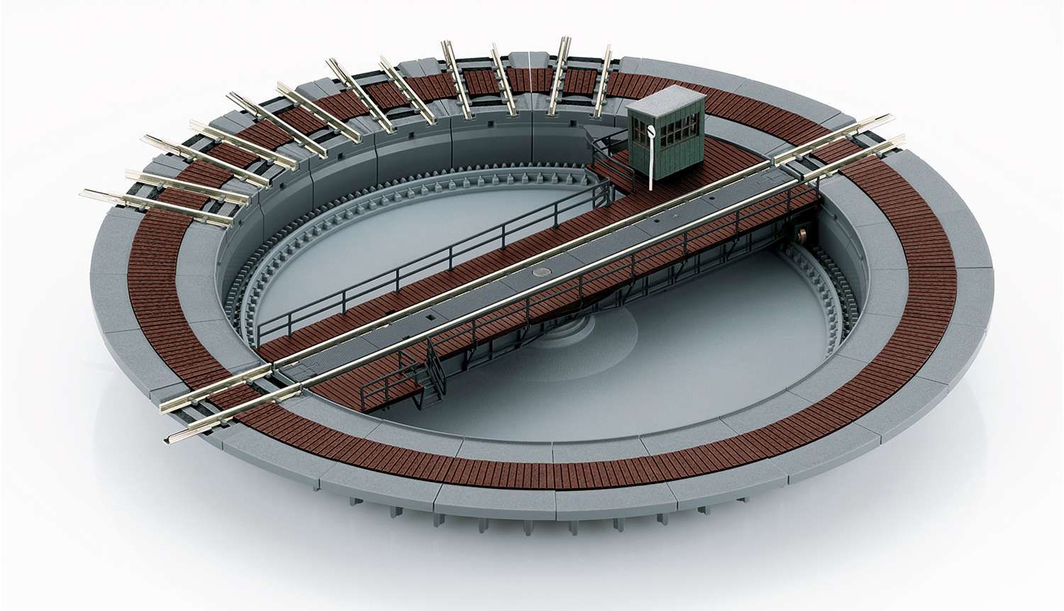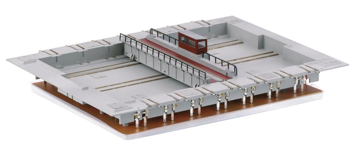 Die Drehscheibe ist in vorbildgetreuer Gruben-Bauweise und in vorbildlicher Darstellung sämtlicher Einzelheiten gefertigt. Die Grundausstattung der Drehscheibe besteht aus 6 Auffahrgleisen und 4 Blindstutzen. Die Auffahrgleise können im Winkel von 7,5' beliebig in Anzahl und Anordnung umgesteckt werden und durch Drehscheiben-Ergänzungs-Sets 9153 auf bis zu insgesamt 48 Gleisanschlüsse erweitert w…