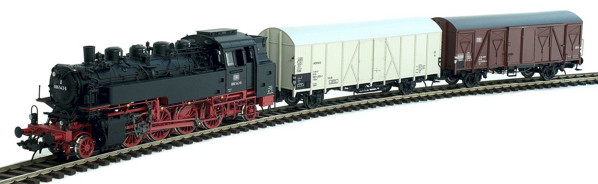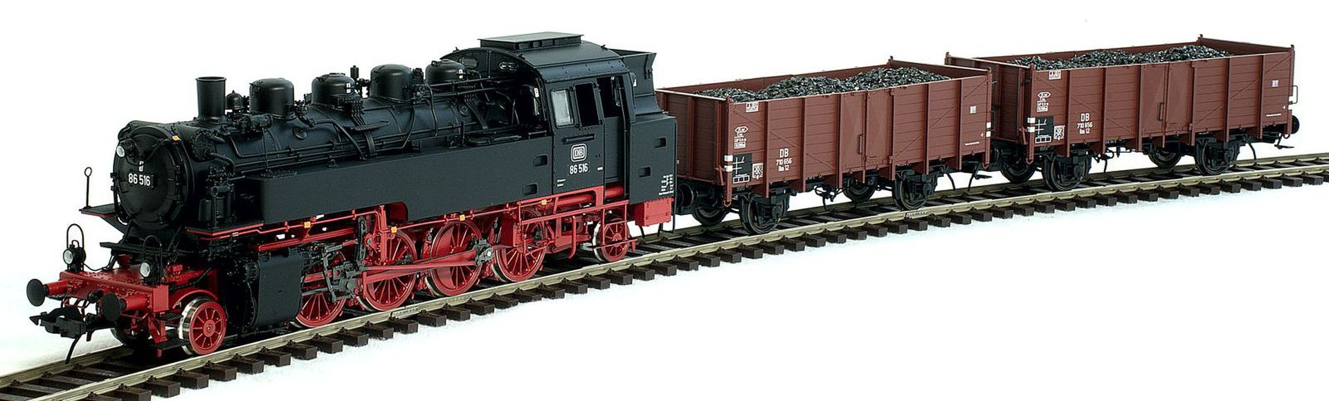 Zug-Set mit einer Dampflok der Baureihe BR86 516 der deutschen Bundesbahn in der Epoche 3, (BD Hannover Bw Goslar) mit zwei offenen Hochbordwagen der Gattung Om12. Die Hochbordwagen (42110-14) sind mit einer echten Kohleladung als Ladegut bestückt.