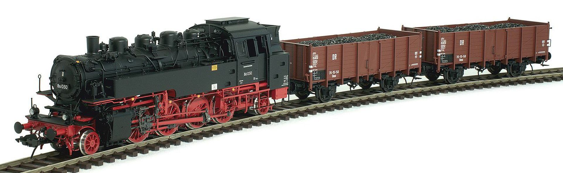 Zug-Set mit einer Dampflok der Baureihe 86 050 der deutschen Reichsbahn in der Epoche 3, (Rbd Dresden Bw Aue) mit zwei offenen Hochbordwagen der Gattung Om12. Die Hochbordwagen (42110-19) sind mit einer echten Kohleladung als Ladegut bestückt.