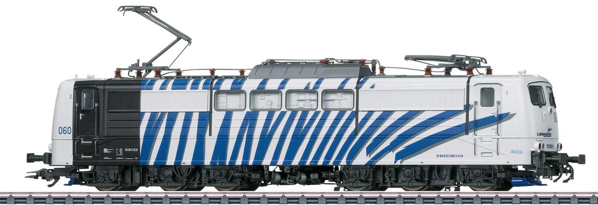 Vorbild: Vorbild: Elektrolokomotive Baureihe 151 der Lokomotion GmbH, München. Lichtgraue Grundfarbgebung mit blauen Zebrastreifen. Betriebsnummer 151 060-1. Betriebszustand ab 2017.
