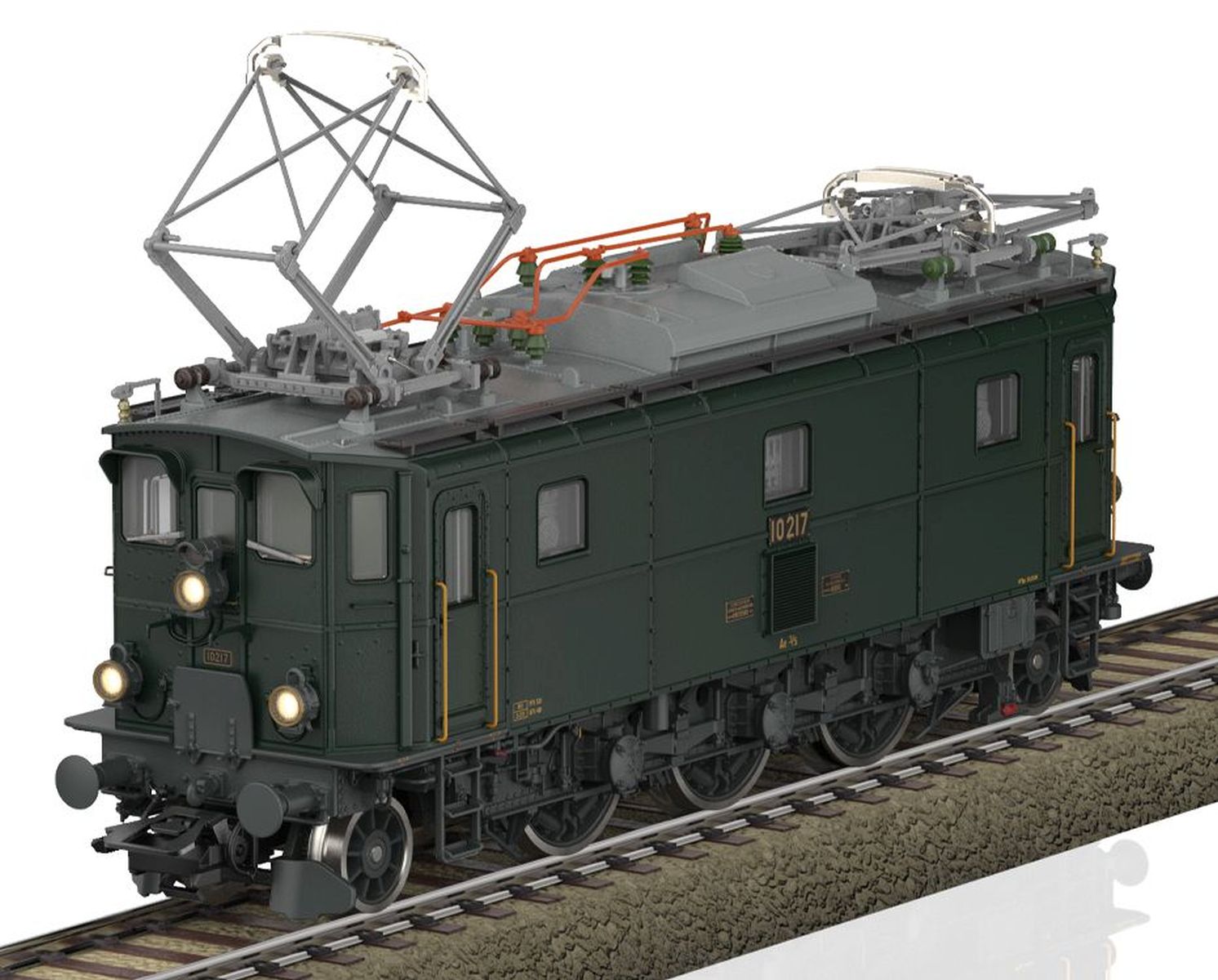 Vorbild: Elektrolokomotive Ae 3/5 der Schweizerischen Bundesbahnen (SBB/CFF/FFS). Mit stirnseitigen Übergangsblechen und Falschfahrsignal über dem oberen Spitzensignal. Tannengrüne Grundfarbgebung mit grauem Fahrwerk. Lok-Betriebsnummer 10217. Betriebszustand 2022.