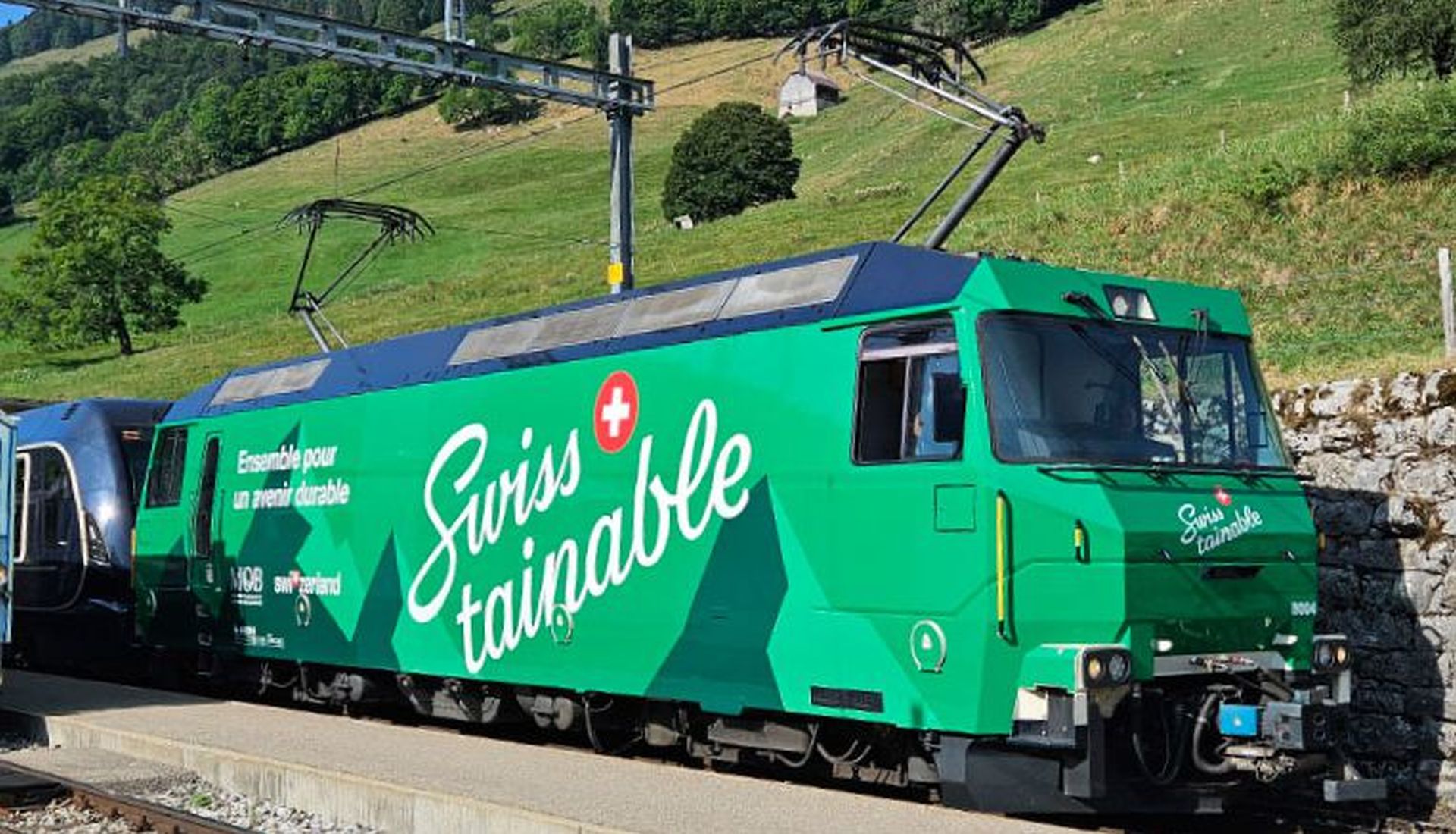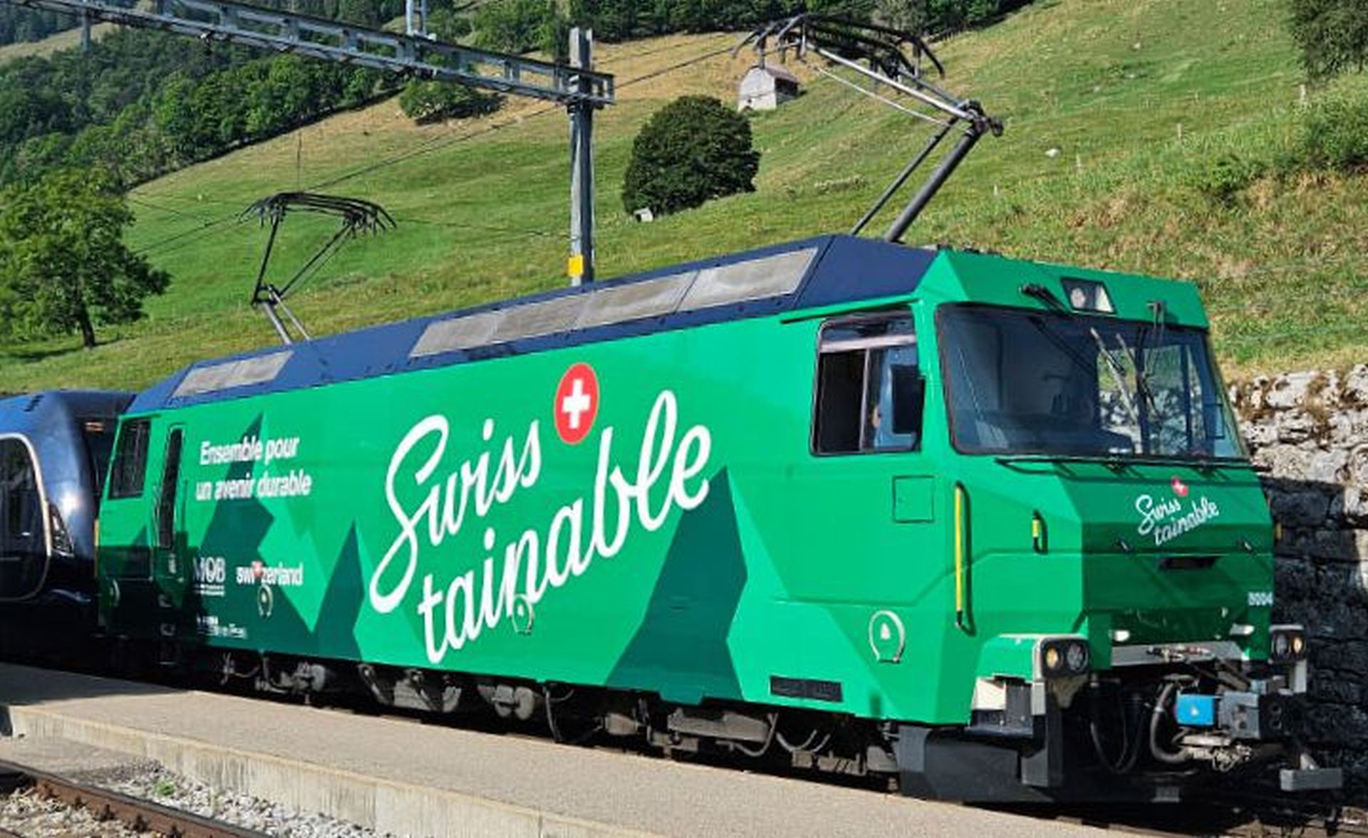 Bereits im letzten Sommer hat die MOB die Ge 4/4 8001 mit neuen Folien beklebt: sie wirbt mit dem Slogan „Swisstainable“ für Schweiz Tourismus. Damit stehen drei verschiedenfarbige Loks Ge 4/4 8001, 8002 und 8004 für den „GoldenPass Express“ (GPX) bereit.