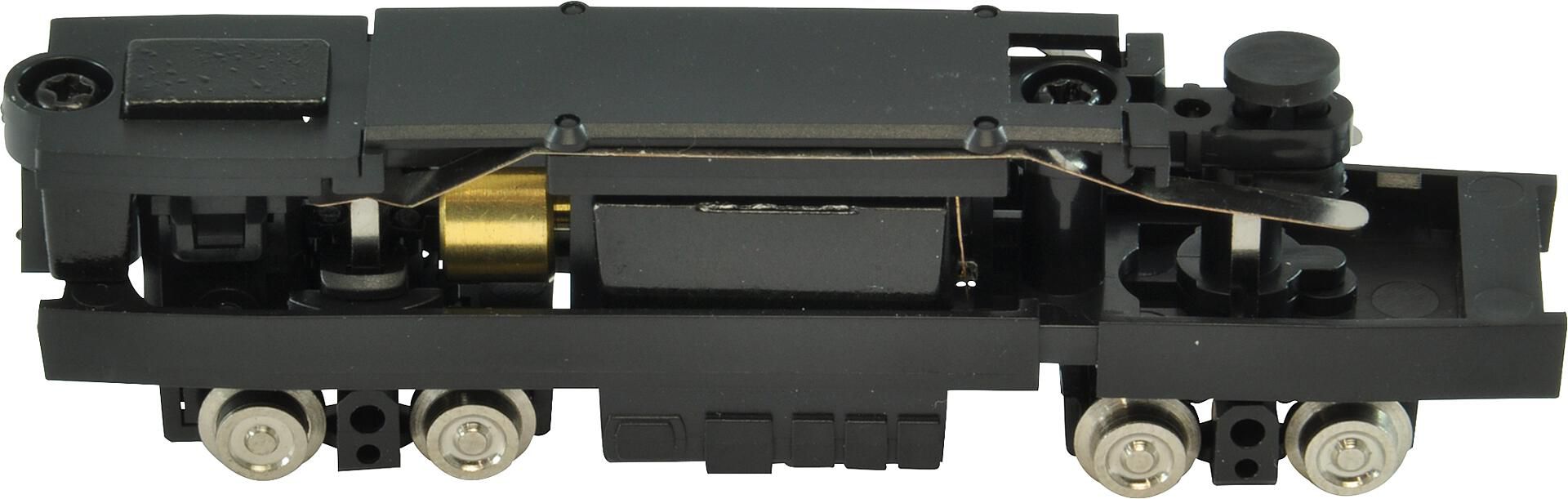 Motorisiertes Fahrgestell für Trams, Achsstand 9,2 mm. Mit Motor, Schwungmasse, Drehgelenk, Antrieb auf vier Achsen. Der Drehgestellabstand kann zw. 36/38,6 mm und 41,2 mm eingestellt werden.