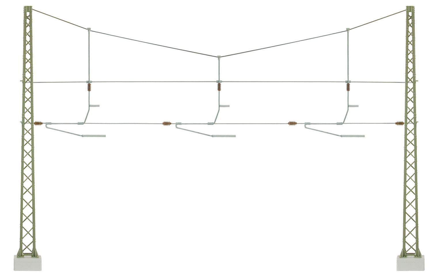 Metallausführung, fertig montiert und lackiert, Masthöhe: 92,5mm, maximaler Mastabstand: 151mm, die Gleisabstände sind beliebig wählbar