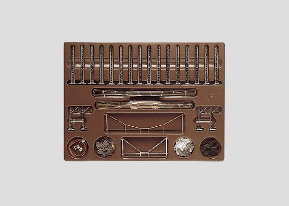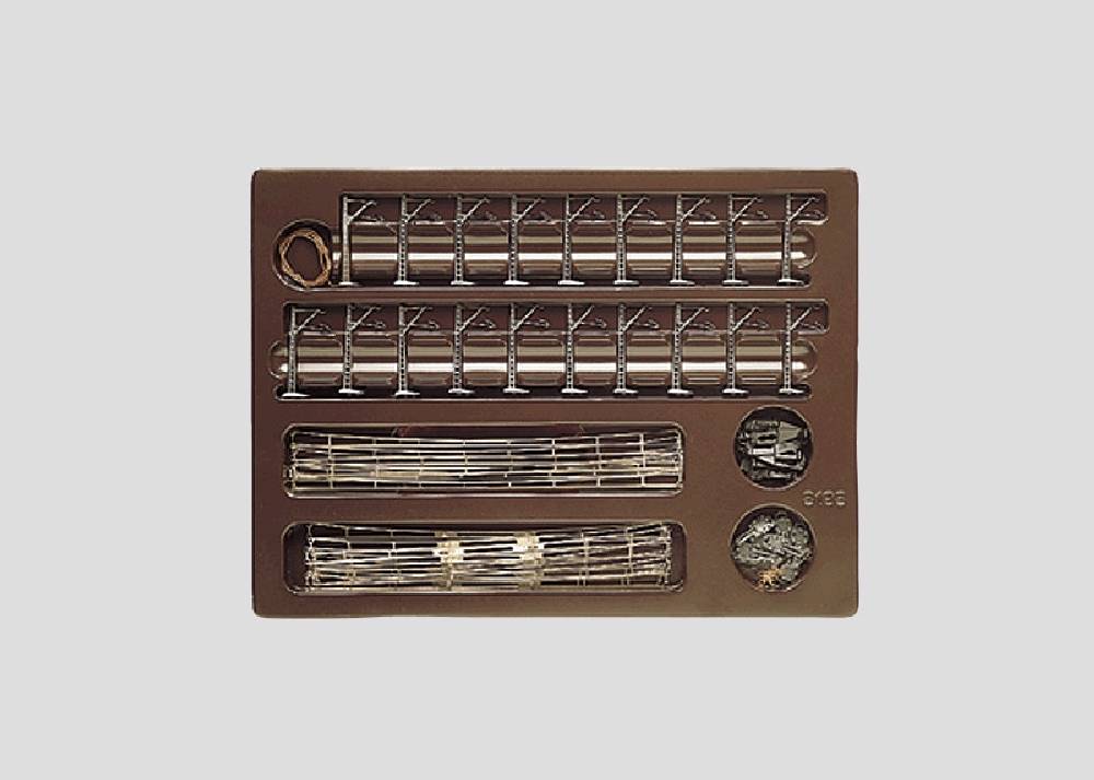 Inhalt: 19 Masten für Fahrleitung, 20 Fahrdrahtstücke, 8 Trennstücke, 6 Verbindungsfedern und Aufbauanleitung