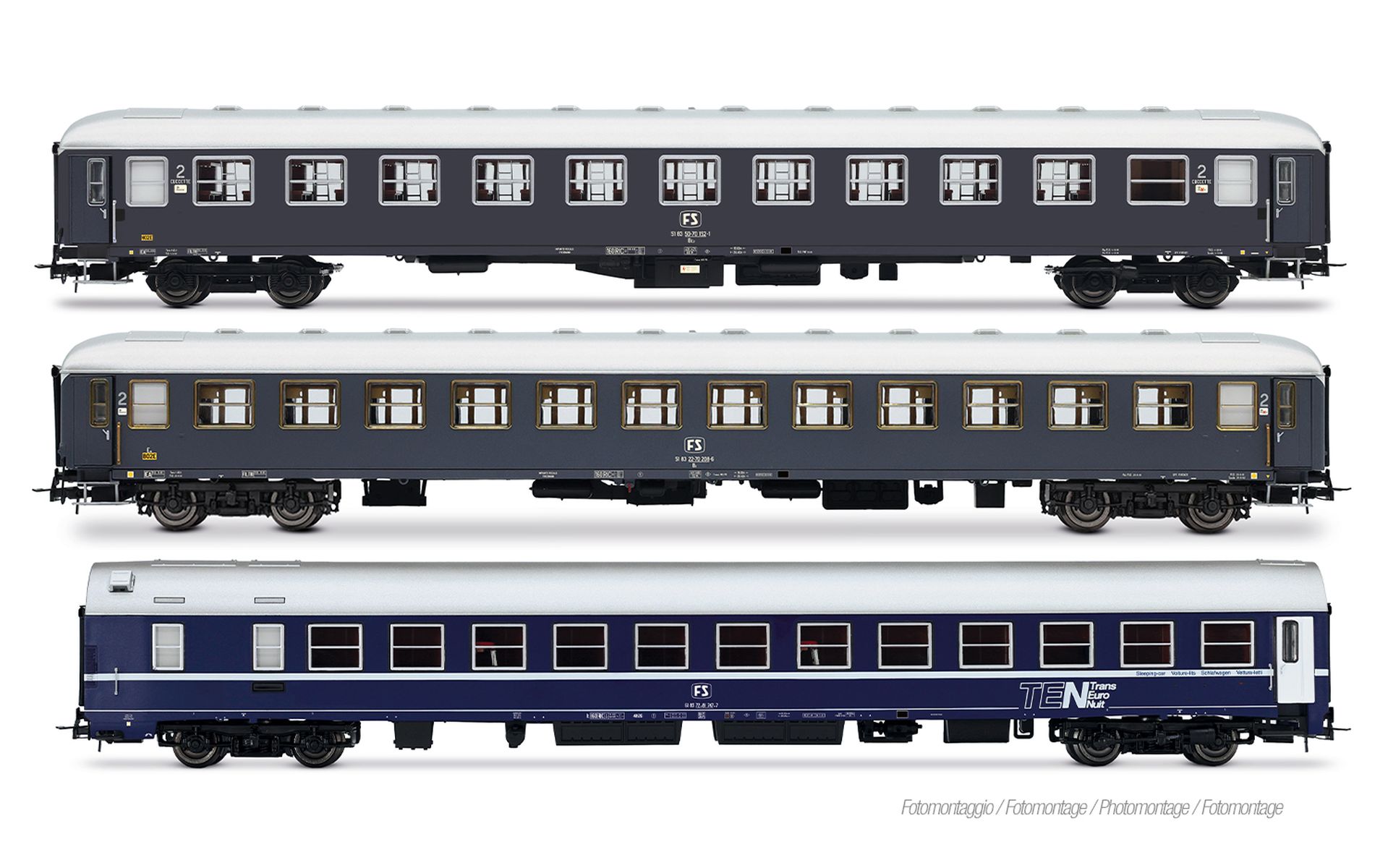 FS, 3-tlg. Set Exp 234-235 Remus Roma – Wien, bestehend aus UIC-X '68 Liegewagen, UIC-X '68 2. Klasse in grauer Lackierung und WLABm MU '73 TEN