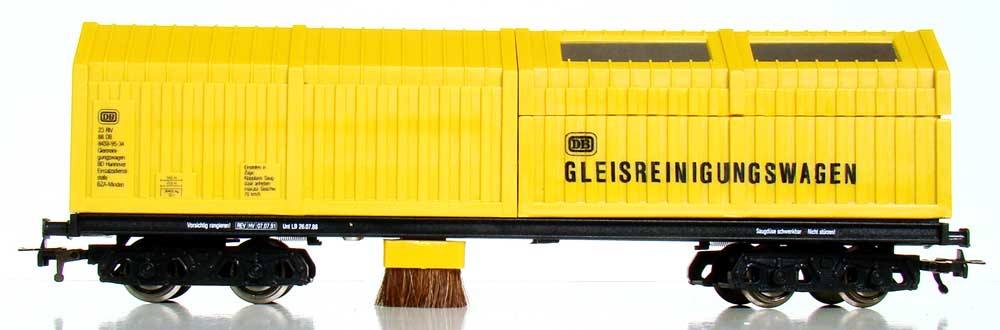 2-achsiger H0 Schienenreinigungswagen auf Basis eines gedeckten Güterwagens mit Bremserbühne. Zur Betriebssicherheit empfohlen, einreihbar in jeden Zug.