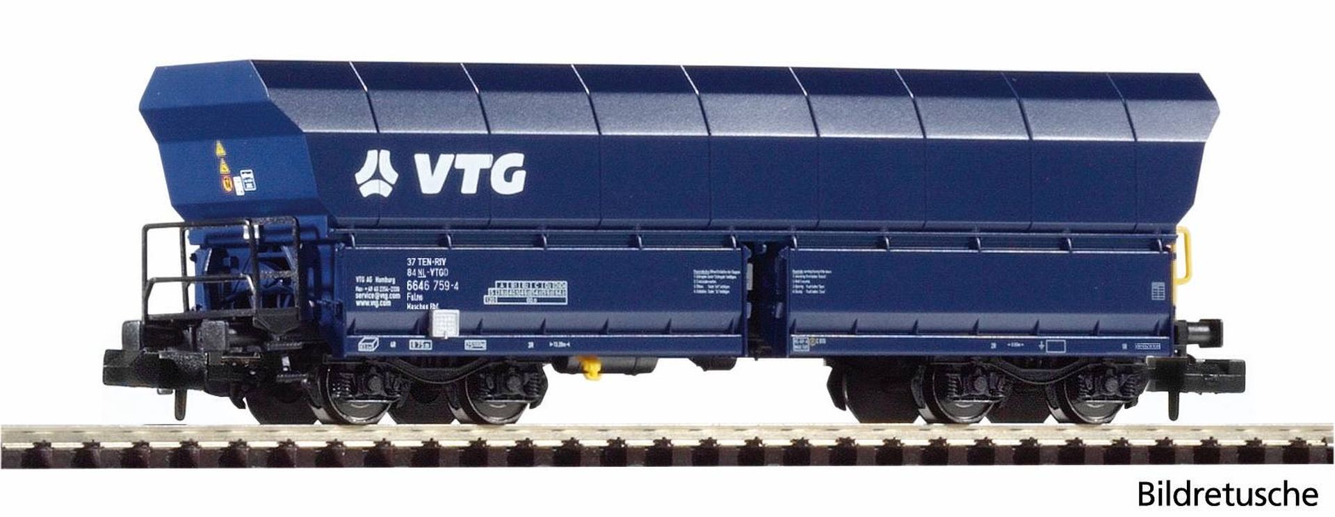 Das Modell überzeugt mit exzellenten Rolleigenschaften, fein gravierten Drehgestellen, Kurzkupplungskinematik, abnehmbaren und verstellbaren Keilen. Die Handgriffe lassen sich ein- und ausziehen.Ohne Ladung