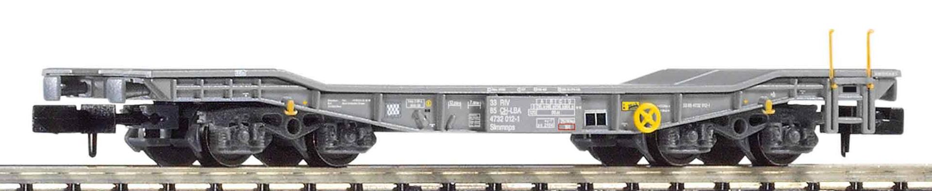 Druckvariante des Schwerlastwagens Slmmps der SBB in der Epoche VI. Das PIKO N Modell entspricht in Form, Farbgebung und Bedruckung dem mehrfach variierten Vorbild.