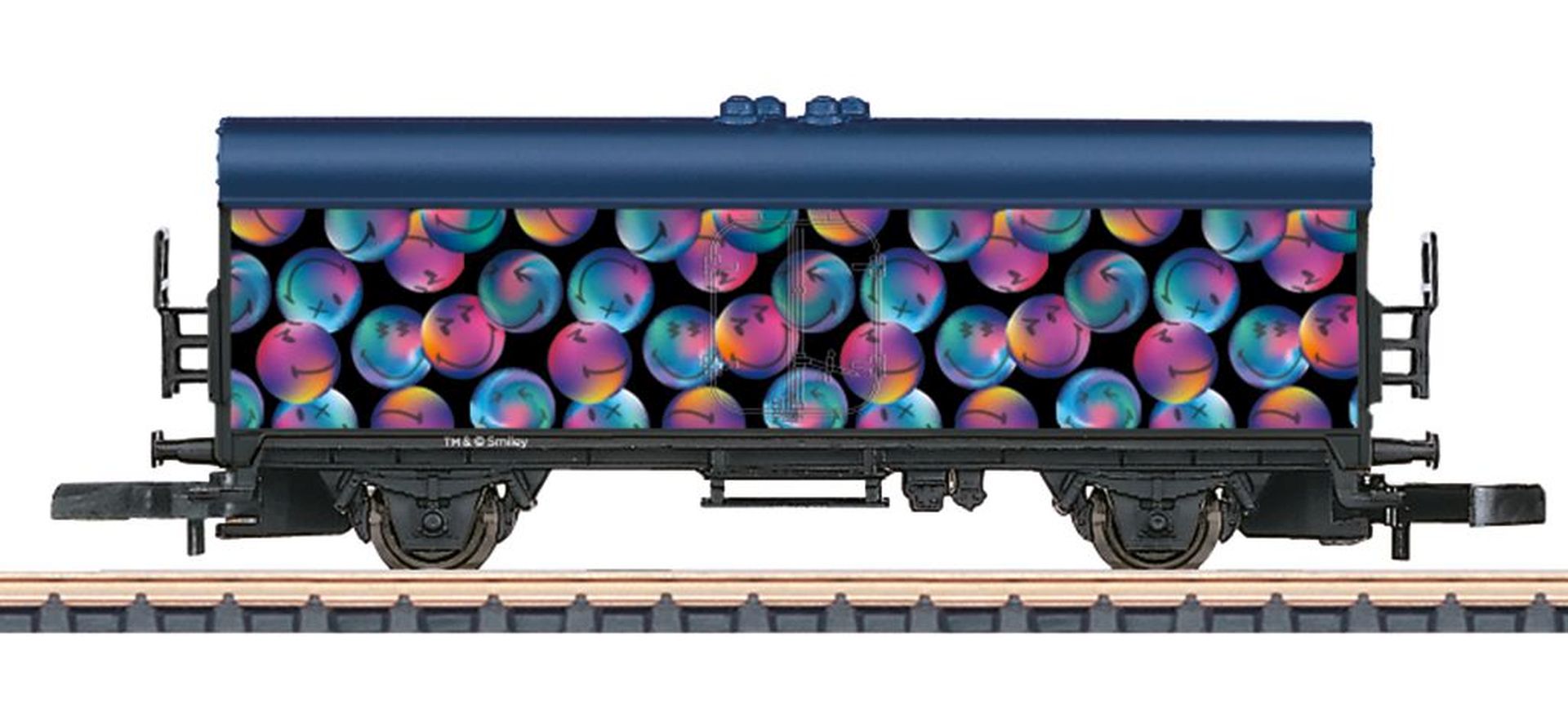 Modell: Erstmalige Auflage eines SmileyWorld® Wagen in Märklin Z. Aufwendige Farbgebung. Scheibenradsätze schwarz vernickelt, angesetzte Bühnen aus Metall. Länge über Puffer 54 mm.