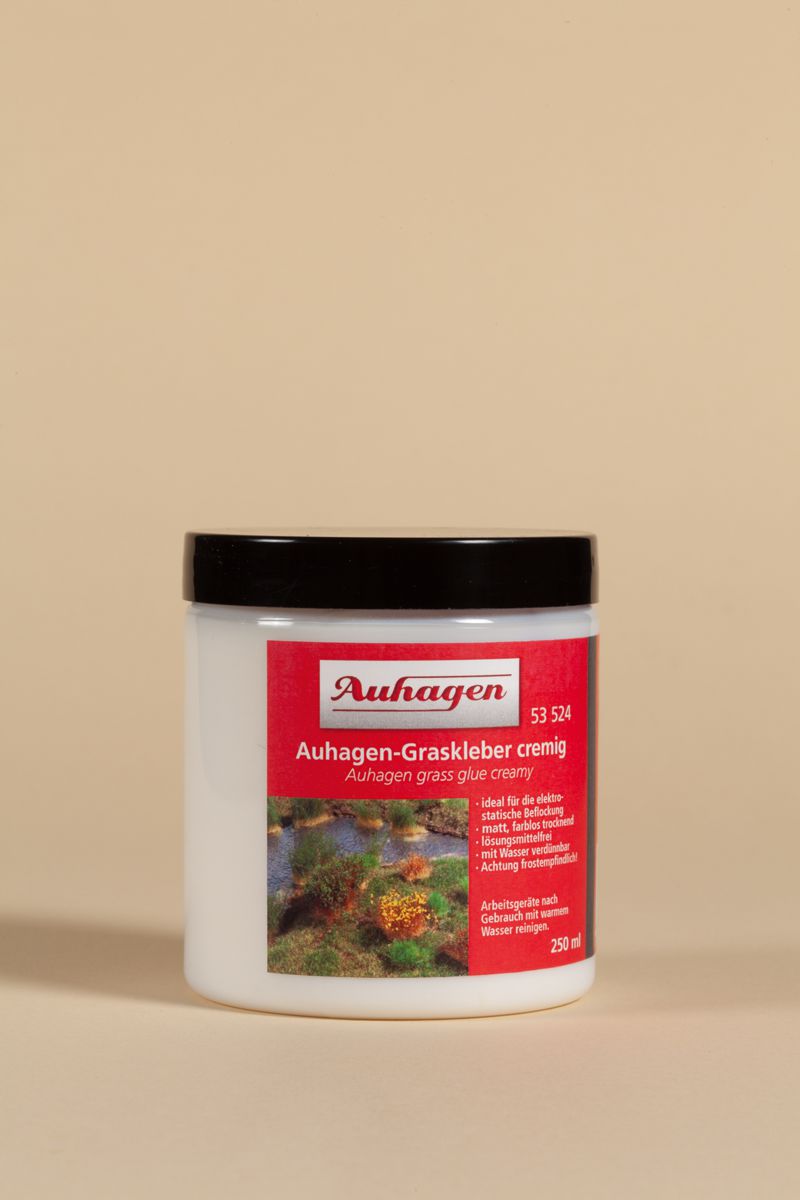 Unser cremiger Auhagen-Graskleber eignet sich besonders bei elektrostatischen Verarbeitung von Grasfasern.