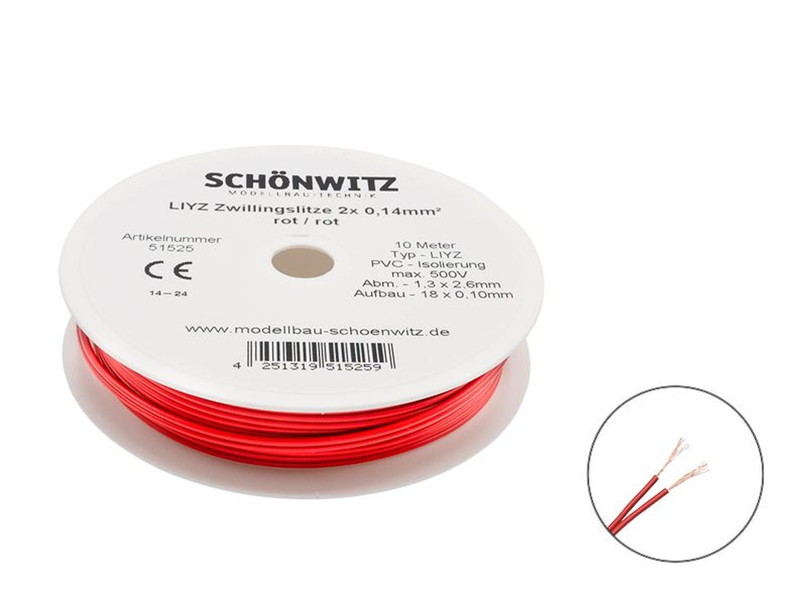 Schönwitz 51525 - 10m LIYZ Doppellitze Zwillingslitze 2x 0,14mm² rot
