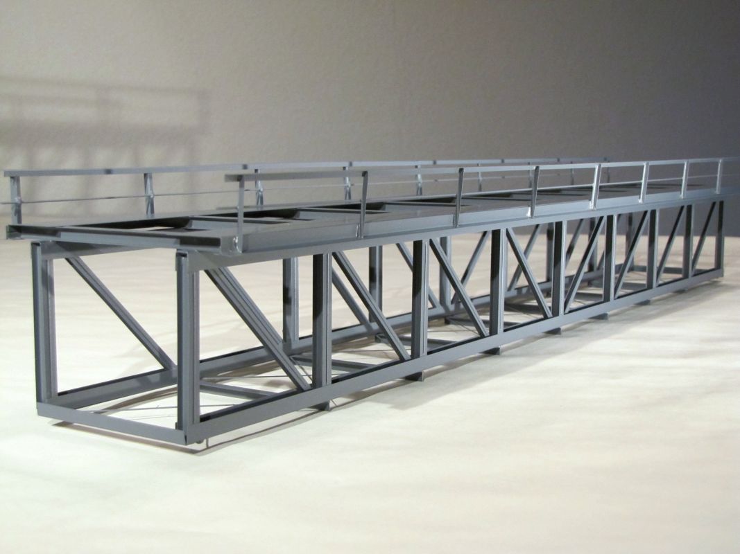 Spur 0. Überspannt mehrere Gleise, Stahlfachwerk- Konstruktion , Holzstufen mit authentischer Holzmaserung, kann variabel, mit den Aufgängen zu verschiedenen Seiten gebaut werden. Und kann mit weiteren Bausätzen problemlos verlängert werden um weitere Gleise zu überbrücken.