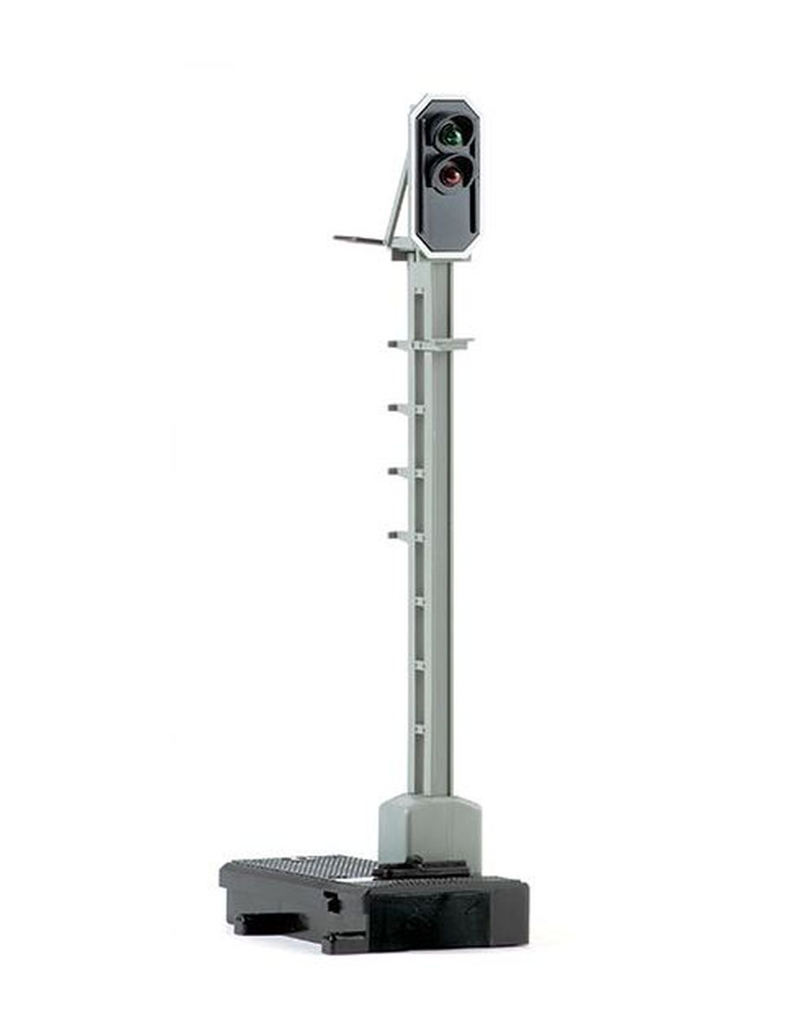Die Rhätische Bahn verwendet Lichtsignale, die entlang der engen Bergstrecken weniger Platz beanspruchen. Das elektrisch betätigte LGB-Signal ist mit von rot auf grün wechselnden Signalleuchten ausgestattet, die an einem vorbildgetreuen Signalmast angebracht sind. Mit LGB-Signalantrieb. Einfacher Aufbau und Verkabelung. Zur Verwendung mit LGB 51755 o.ä. Höhe: 240 mm.