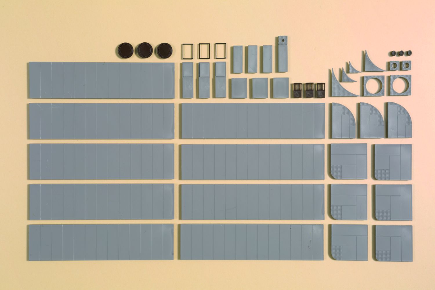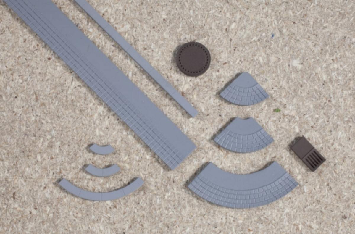 9 gerade Bordsteinkanten und je 3 verschiedene Bögen jeweils mit passendem Schnittgerinne, 3 abgesenkte Bordsteinkanten je 37 mm, 6 Kanaldeckel R 10 mm, 6 Gullideckel und 6 Deckel für Unterflurhydranten oder Absperrschieber. Zur Gestaltung des Fußsteiges eignen sich der Artikel 52236 Pflastersteinplatte gerade, 42576 Pflastersteinplatte und 41206 Betonverbundpflasterplatte.