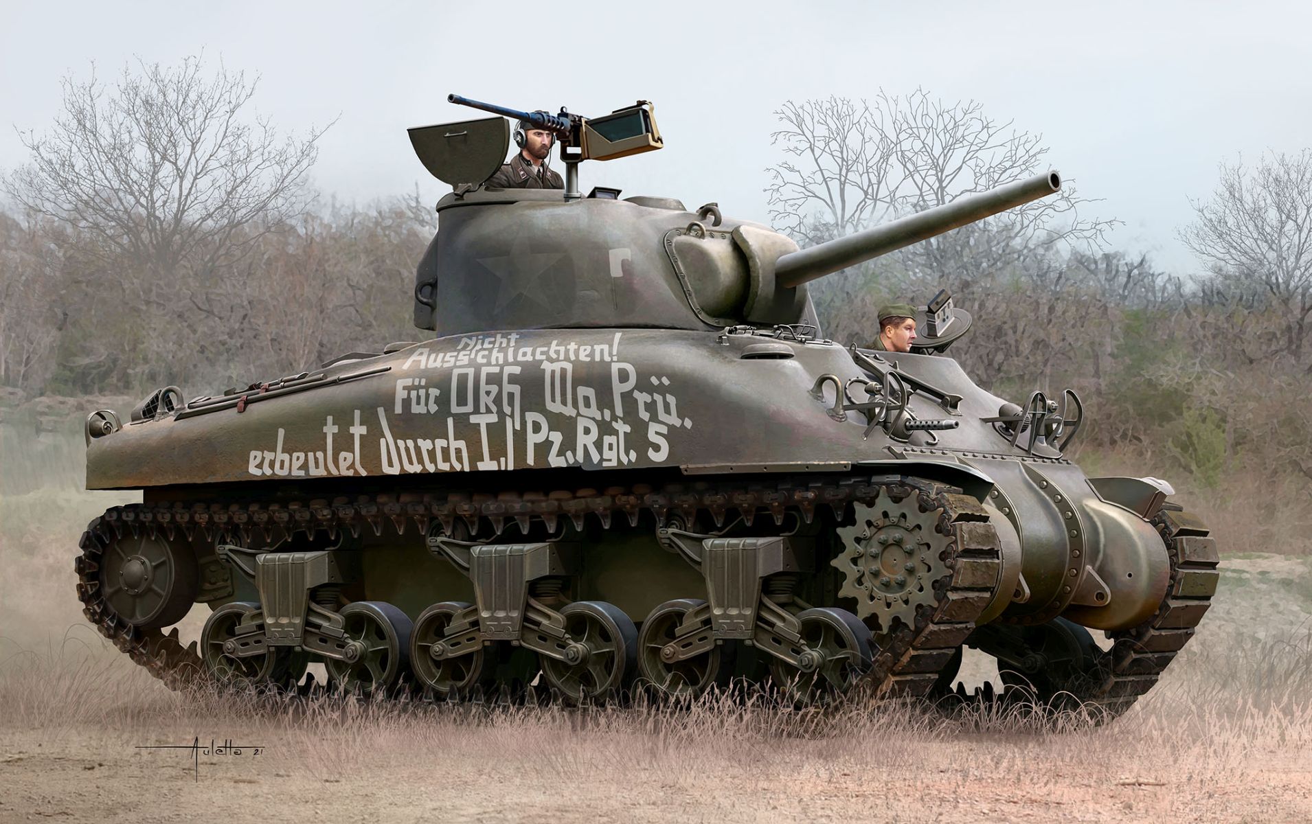 Modellbausatz des meistgebaute US-Panzer im Zweiten Weltkrieg, dem Sherman. Mängel in der Panzerung konnten die Shermans durch zahlenmäßige Überlegenheit und große Beweglichkeit ausgleichen. · Beweglicher Geschützturm · Detaillierte Oberflächen Authentische Darstellung folgender Versionen: - Sherman M4A1, unknown unit, german booty tank - Sherman M4A1, Company D, 66th Armoured Regiment, 3rd Armoured Division, "Spearhead" Division Operation Cobra, July 1944, Normandy Campaign