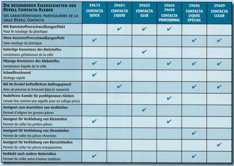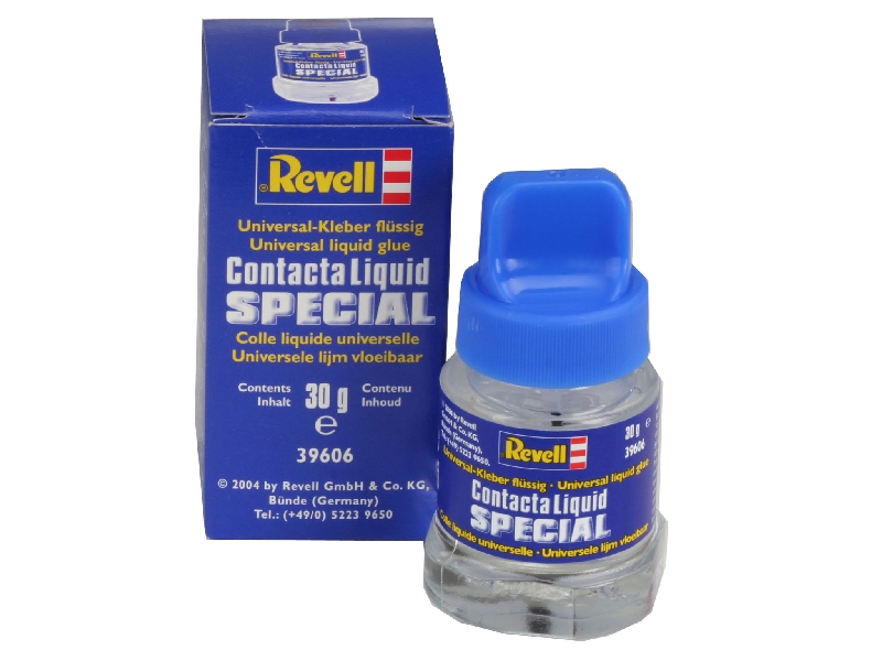 Revell Contacta Liquid Special ist ein spezieller Chrom-Klebstoff, der aber sehr universell eingesetzt werden kann. Da die Chromschicht den Verschweißungs-Effekt verhindert, kratzt man entweder die Chromschicht weg oder - wesentlich eleganter - nimmt den Spezial-Kleber von Revell. Auch Klarsichtteile wie Fenster oder Cockpit-Hauben lassen sich damit gut montieren, weil diese durchsichtigen Teile dadurch nicht angegriffen werden. Revell Contacta Special verklebt auch Metall, Holz, Papier, Pappe, Glas und Textilien sowohl mit Kunststoff als auch untereinander.