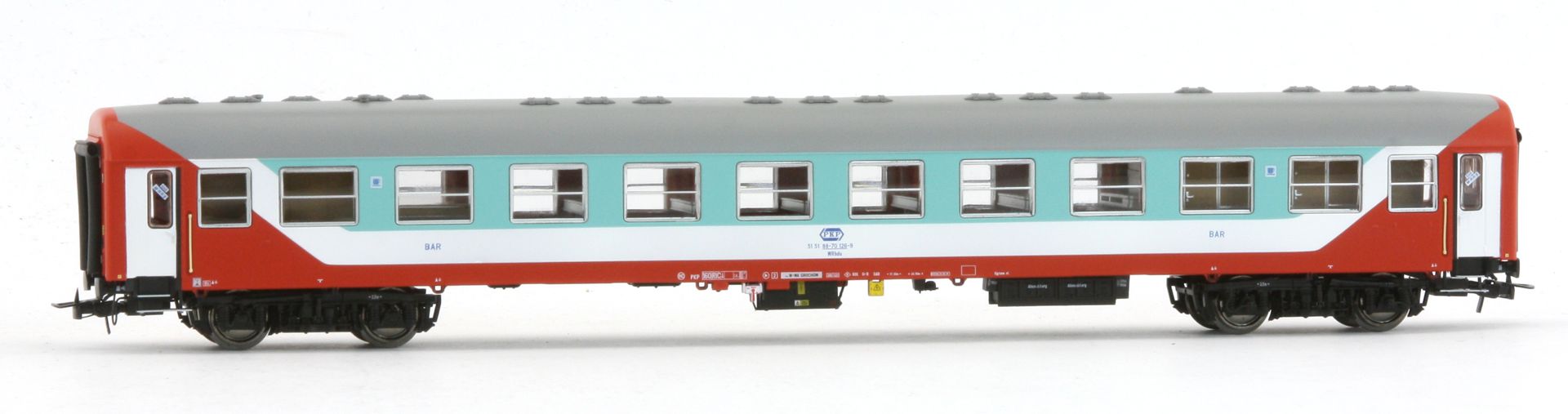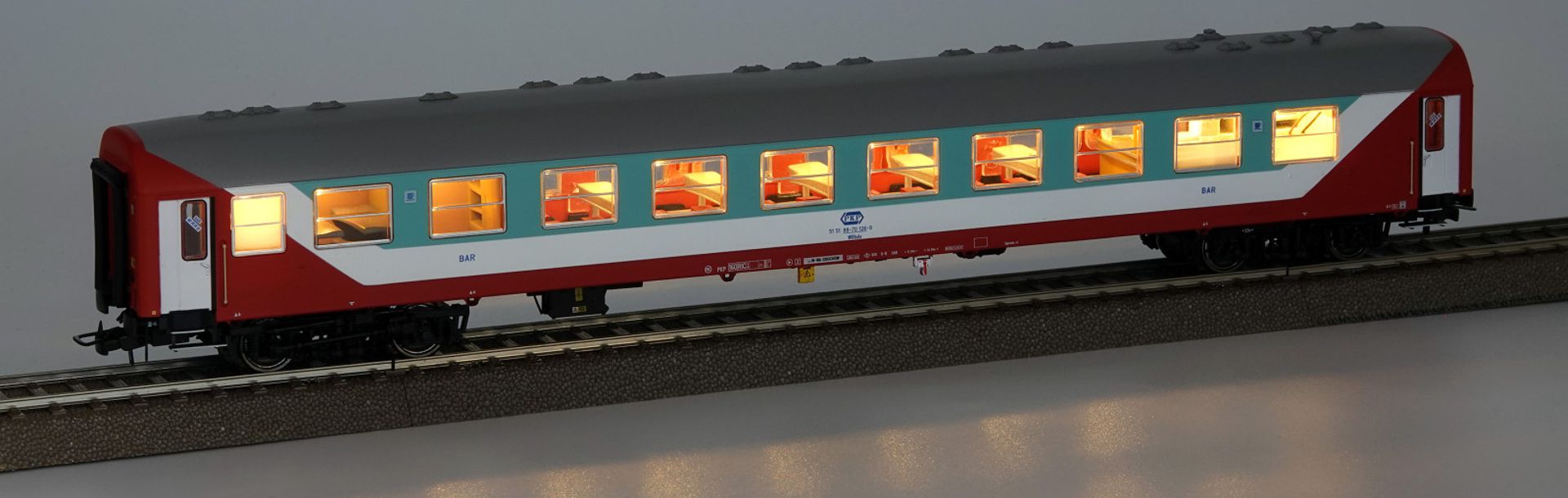 Modell mit Innenbeleuchtung. Modell eines Barwagens in der Lackierung "PAPUGA" oder "TUNING". Der Wagen Typ 113A in dieser Lackierung wurde nur in einem Exemplar gebaut. Die "Papageien"-Lackierung war für die höhere Kategorie von Zügen gedacht und wurde in den frühen 2000er Jahren hauptsächlich auf Z-Wagen in Schnellzügen verwendet.