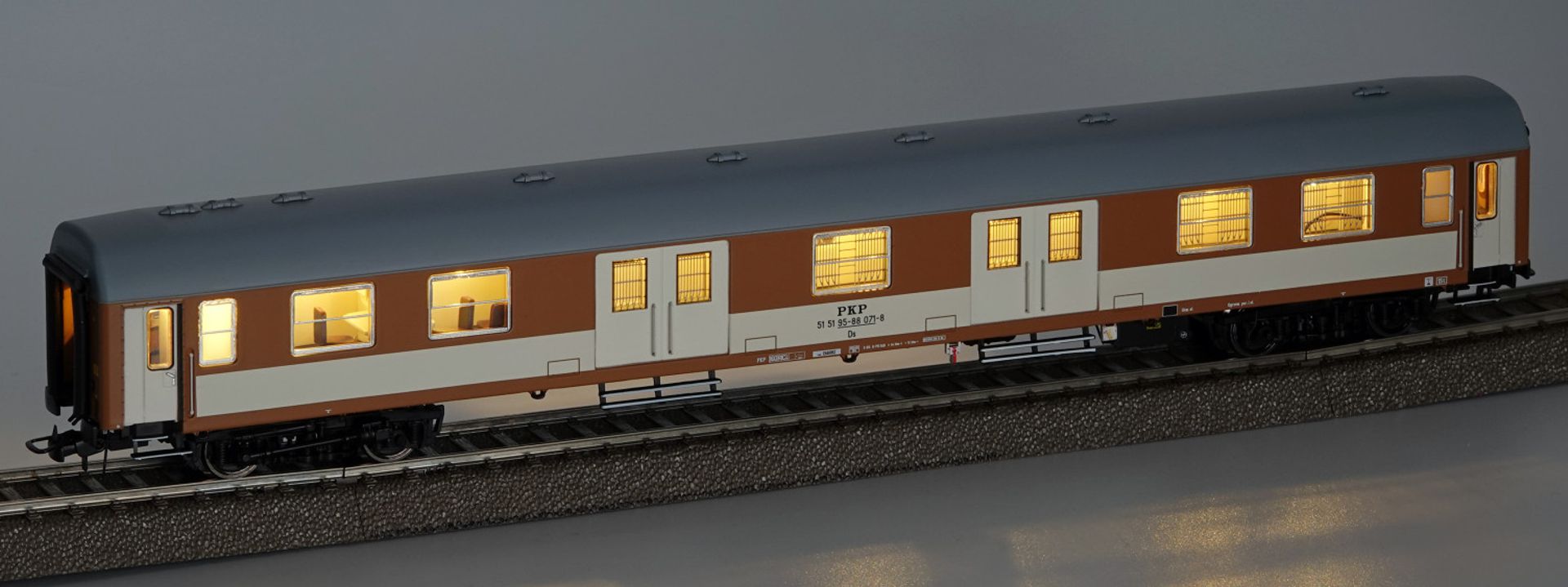 Modell mit Innenbeleuchtung. Modell eines Gepäckwagens Typ 209C. Bahnhof Zagórz.