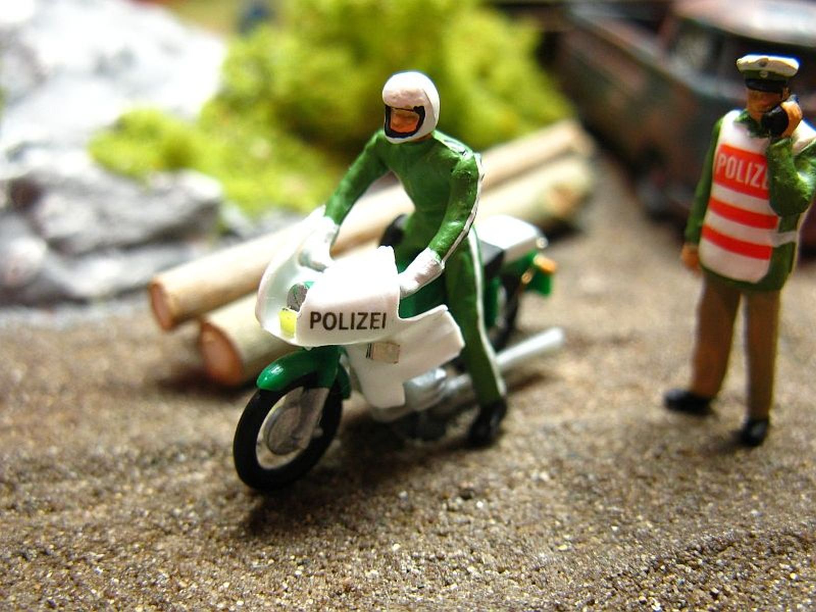 Sie erhalten ein komplett beleuchtetes Polizeimotorrad mit aufsitzendem Fahrer im Maßstab 1:87 in Spur H0. Das Krad (Kraftrad) ist mit einem warmweißen Vorderlicht, einem roten Rücklicht und zwei Blaulichtern ausgestattet. Die Verkabelung zu den LEDs ist fast unsichtbar und wurde in mühevoller Handarbeit in das Modell eingearbeitet und retuschiert.