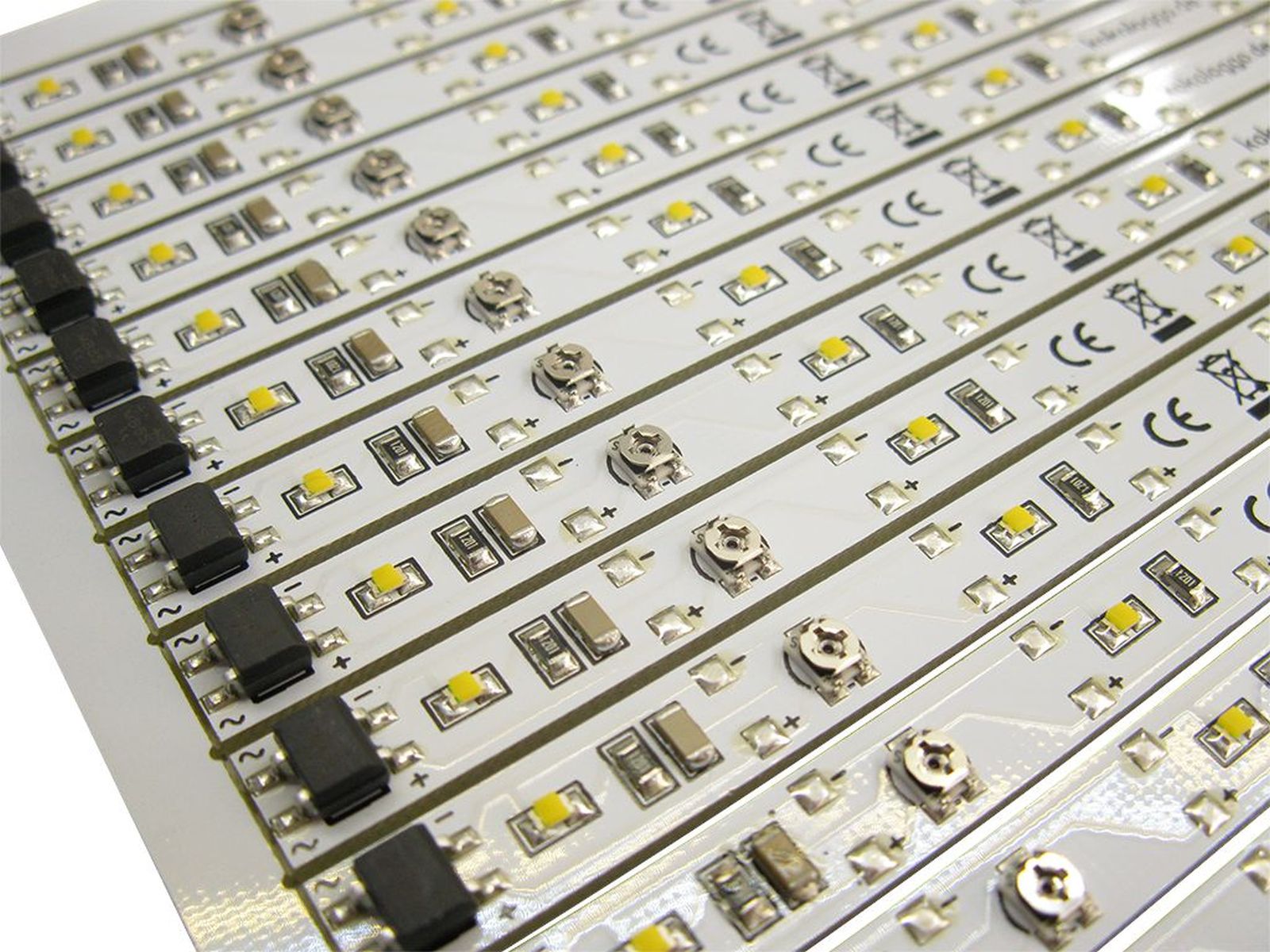 Der Platinenrand des Produktionsnutzen kann mit einer Flachzange oder den Fingern vorsichtig von den 15 Waggonbeleuchtungen getrennt werden. Die Stellen dafür sind vorperforiert.