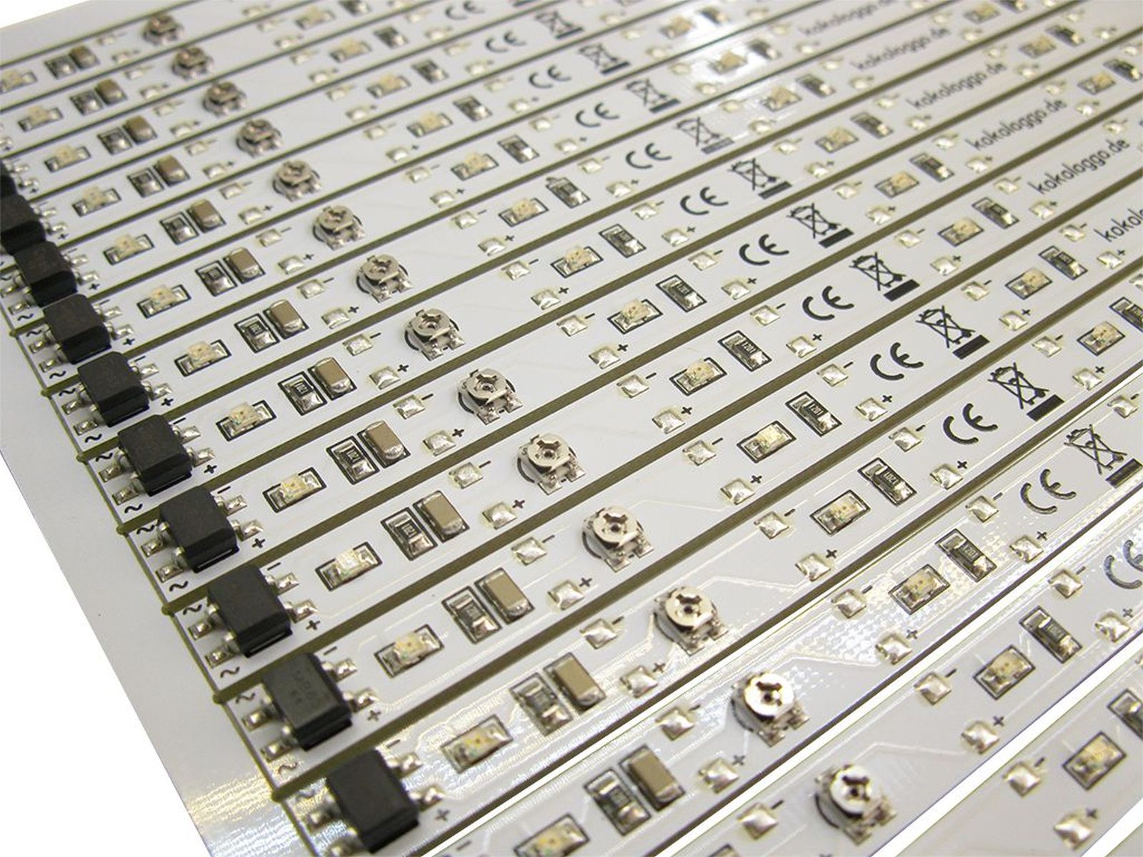 Der Platinenrand des Produktionsnutzen kann mit einer Flachzange oder den Fingern vorsichtig von den 15 Waggonbeleuchtungen getrennt werden. Die Stellen dafür sind vorperforiert.