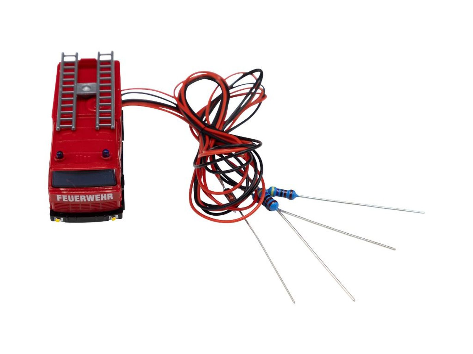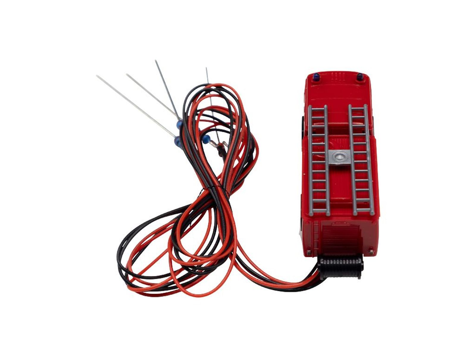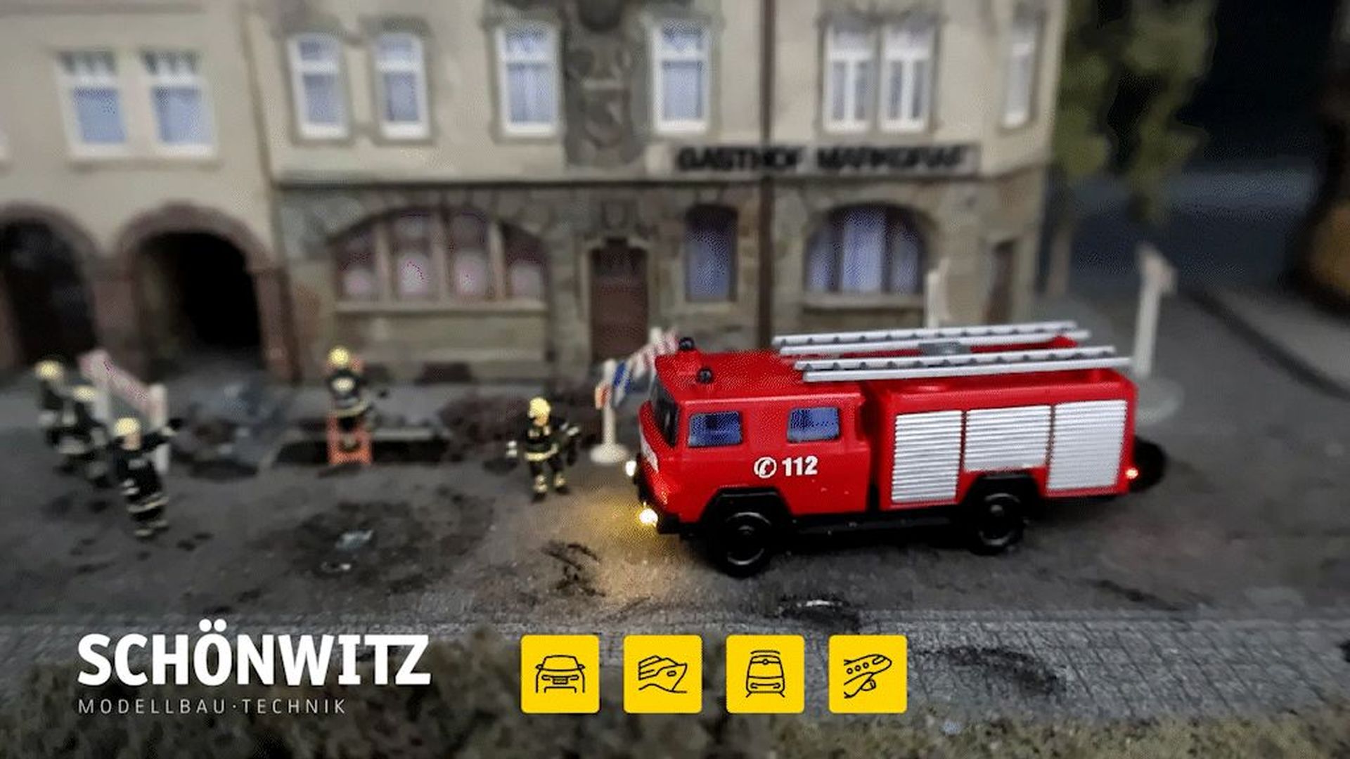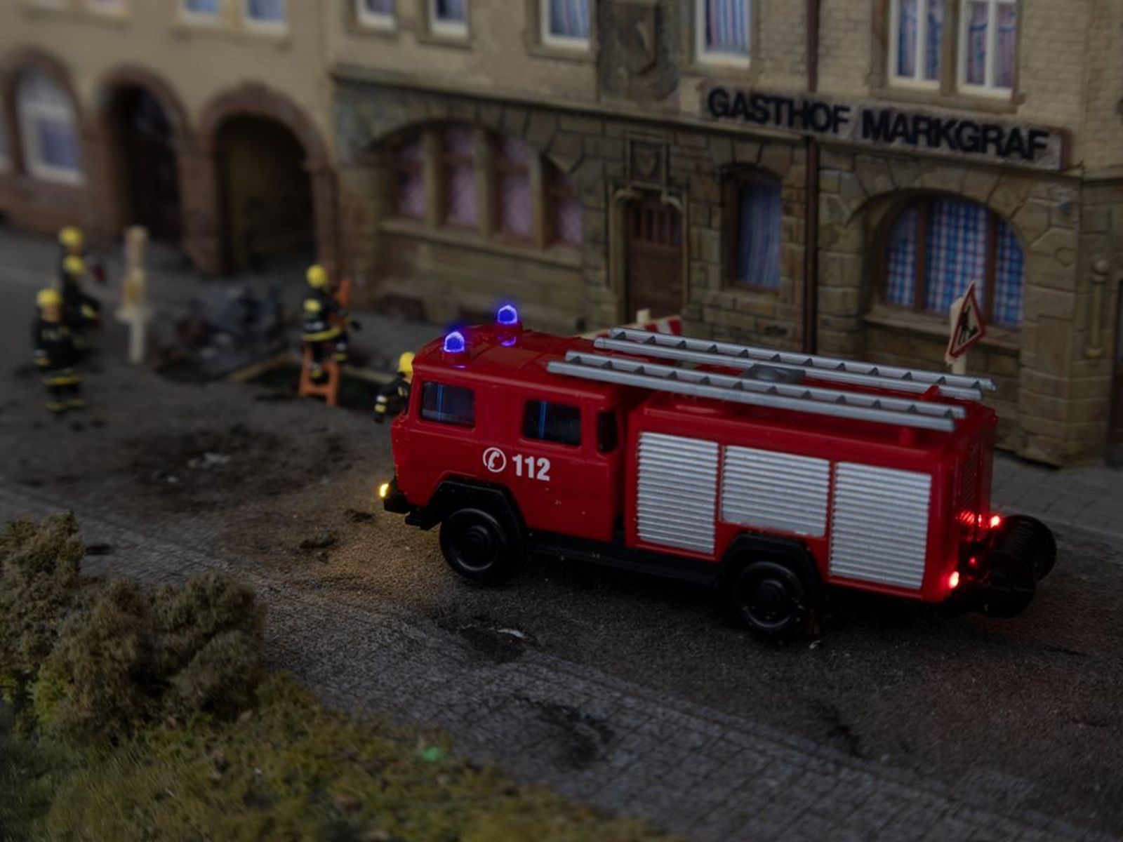 Detailgetreu nachgebildetes Feuerwehrfahrzeug LF 16 Magirus als Fertigmodell mit aufwendig verbauter LED-Beleuchtung. Sechs winzige SMD-LEDs, perfekt auf das Fahrzeug abgestimmt und sauber verarbeitet, bringen den Feuerwehralltag eindrucksvoll in Ihre Modellbahnlandschaft.