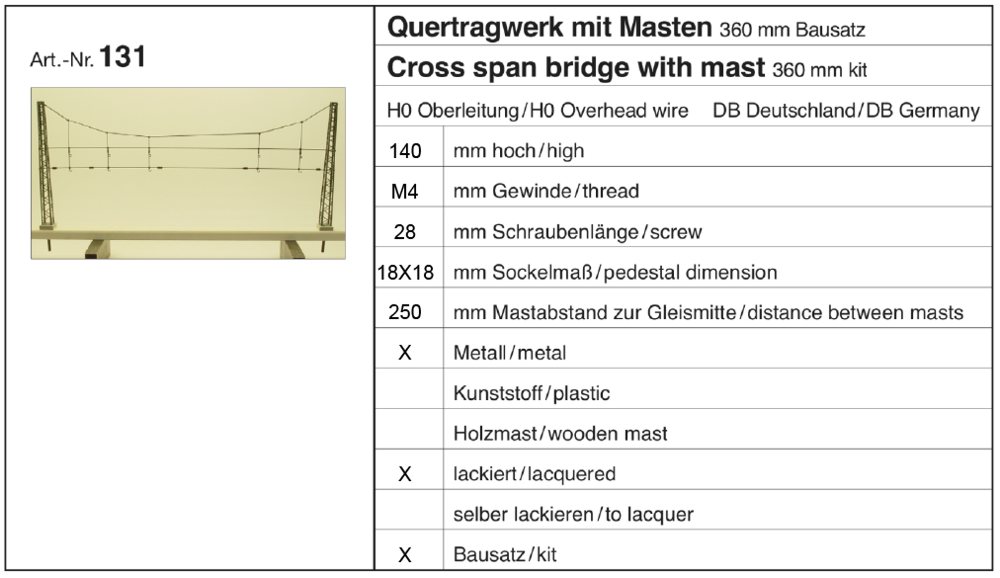 Dieses Quertragwerk (6 Gleise) ist sehr einfach im Aufbau. Hänger und Seitenhalter sind ein Teil. Eine elektrische Trennung ist möglich. Genaue Bauanleitung liegt dem Bausatz bei (je Gleis ein Hänger).