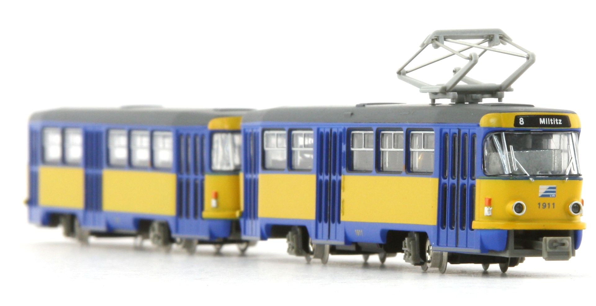 Standmodell eines Straßenbahnwagens der Marke Tatra, Set mit 2 Wagen, Triebwagen Typ T4 und Anhänger B4, hier in den Farben der Leipziger Verkehrsbetriebe. Leipzig, die größte Stadt des Freistaats Sachsen in Ost-deutschland hat ein Streckennetz von rund 146 Kilometer. Das Modell beinhaltet den Antrieb TM-TR0 zur Motorisierung.