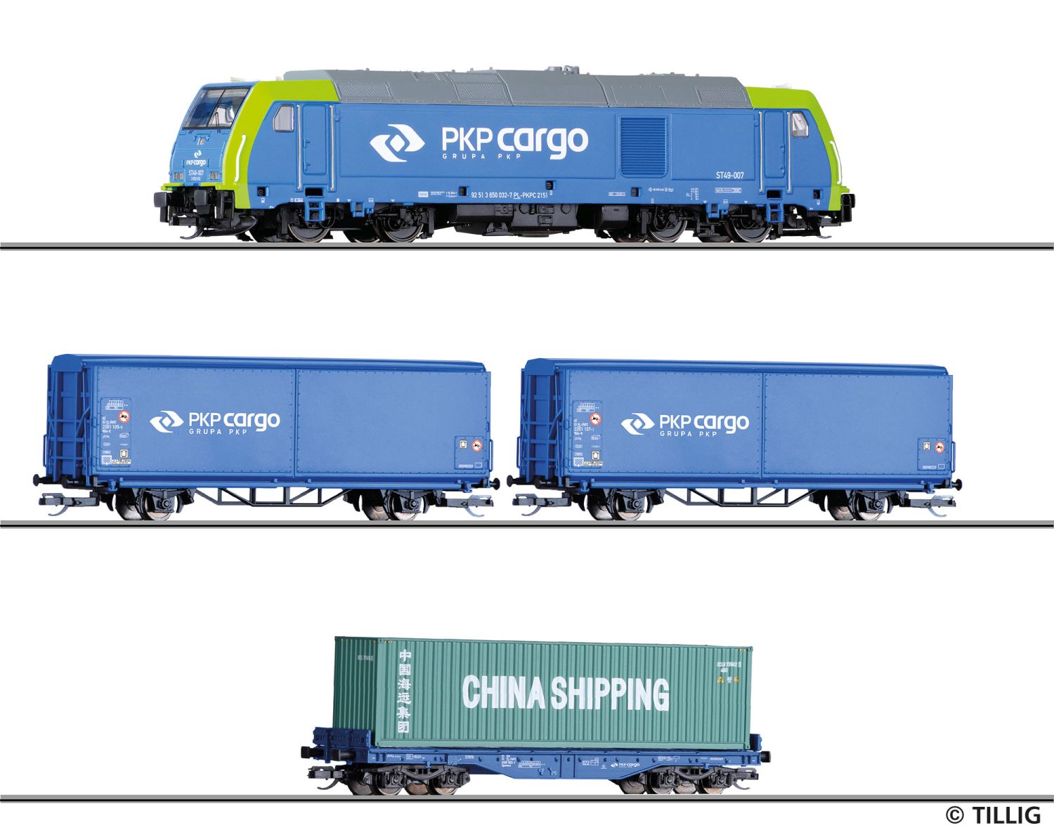 Diesellokomotive „TRAXX“, zwei Schiebewandwagen Hbis-tt und ein Containertragwagen Sgmmns mit 40'-Container, Bettungsgleisoval - Platzbedarf 70 cm x 85 cm, neuer TILLIG Fahrregler (ohne Zubehörausgang), Aufgleiser, Handentkuppler, zusätzlich enthalten sind ein 10,- EUR-Gutschein für den Kauf eines Gleiserweiterungssets (01833, 01834, 01835, 01836 und 01837)