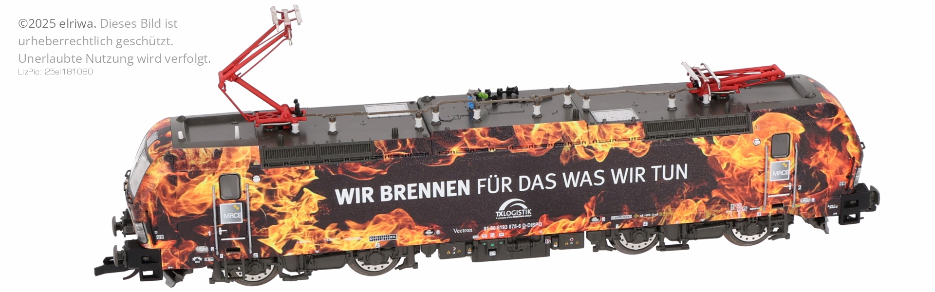 Mittlerweile gibt es vom Vectron sehr viele Werbeloks. Trotzdem stechen immer wieder besondere Exemplare heraus. So z.B. diese "Flammenlok" von TX-Logistik mit dem Werbespruch "Wir brennen für das was wir tun". Die von MREC angemietete und von Loc & More designte Lok wollen wir zusammen mit Tillig als TT-Modell umsetzen. Die ersten Druckmuster (siehe Bilder) sind bereits vielversprechend. Die Bedruckung ist enorm aufwendig und somit ist das Modell auch etwas teurer als die vergleichbaren Standardmodelle. Dazu kommen noch diverse Lizenzgebühren. D.h. damit wir dieses Projekt realisieren können, bedarf es einer gewissen Produktionsmindestmenge. Diese Menge liegt bei ca. 350 - 500 Stück.