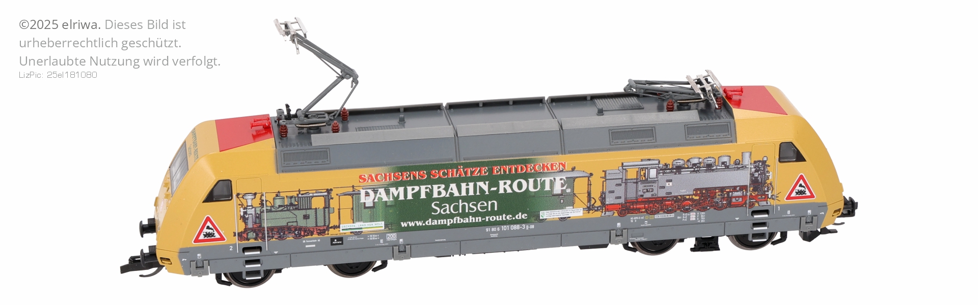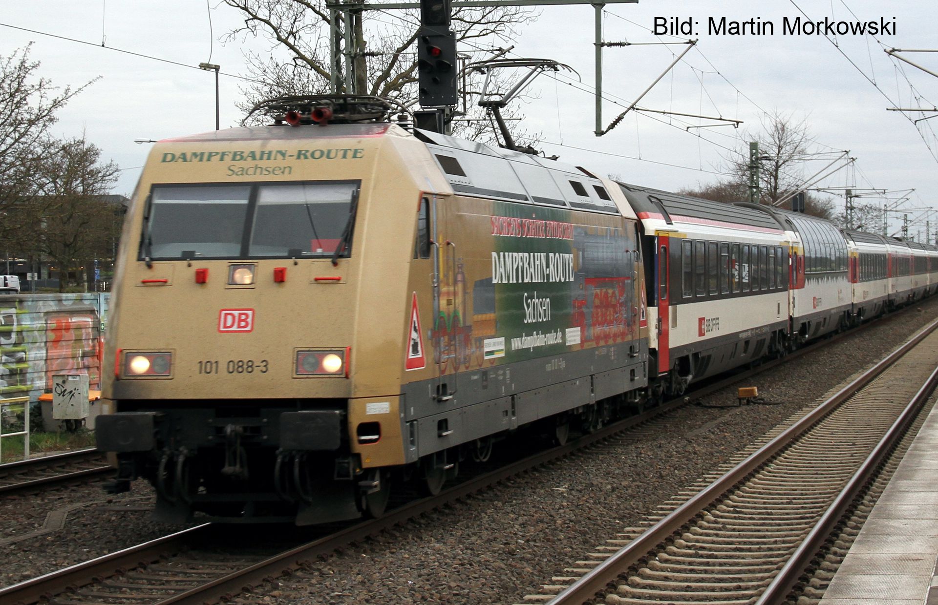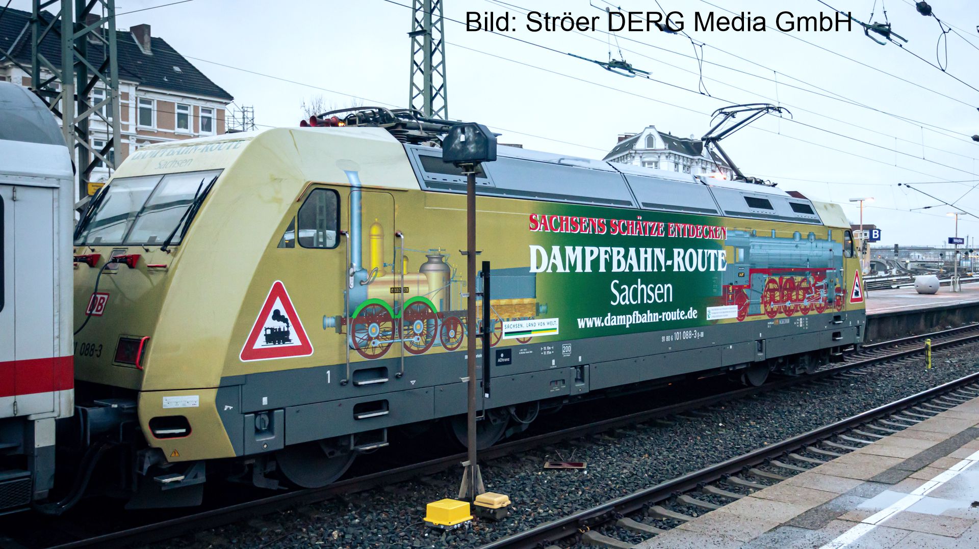 Seit Dezember 2021 ist die Elektrolokomotive 101 088 als Werbelokomotive für die DAMPFBAHN-ROUTE Sachsen unterwegs. Die Lokomotive der Baureihe 101 wurde seither im Fernverkehr bei der Deutschen Bahn AG vor EC- und IC-Zügen in Deutschland und teils auch grenzüberschreitend nach Österreich und in die Schweiz eingesetzt. Die beidseitig beklebte Lokomotive macht auf das Dampfbahn- und Reiseland Sachsen aufmerksam. Die Ellok zeigt auf beiden Seiten markante sächsische Dampflokomotiven. Eine Seite repräsentiert mit Dampflokomotiven der Gattungen I K und VII K Fahrzeuge der sächsischen Schmalspurbahnen. Die andere Seite zwei regelspurige: mit der historischen „Saxonia“ die erste 1838 in Deutschland gebaute Lokomotive sowie mit dem 'Sachsenstolz' eine Schnellzugdampflok aus der Zeit um 1920. Mit der auffälligen Werbe-Lokomotive werden Inspirationen zum Besuch der zahlreichen Dampfbahn-Highlights und facettenreichen Angebote zum Übernachten, Genießen und Entdecken in Sachsen gegeben. Die DAMPFBAHN-ROUTE Sachsen ist seit 2010 als Marketing-Netzwerk mit inzwischen mehr als 180 Kooperationspartnern aktiv. Das ambitionierte Projekt wird durch den Freistaat Sachsen gefördert.