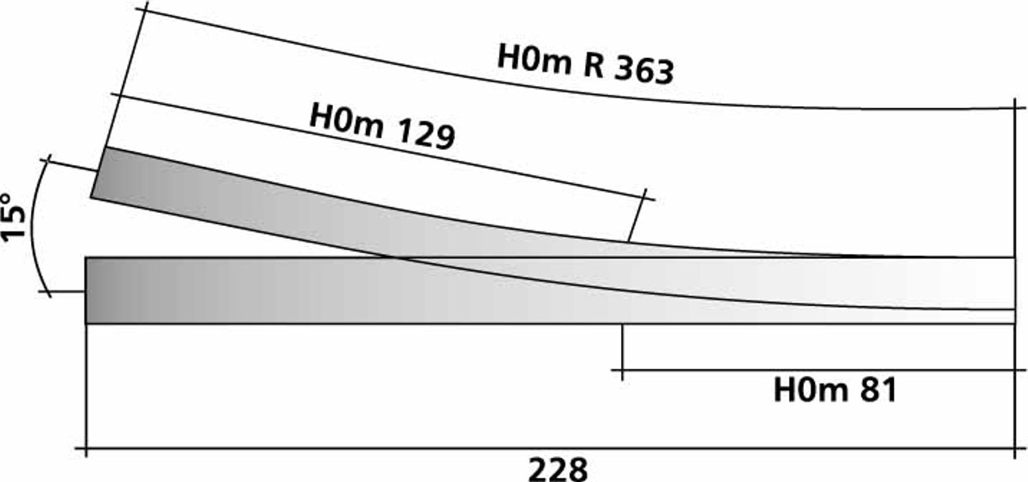 Abzweig rechts H0-H0m, Abzweig 15', Radius 363, 228 mm