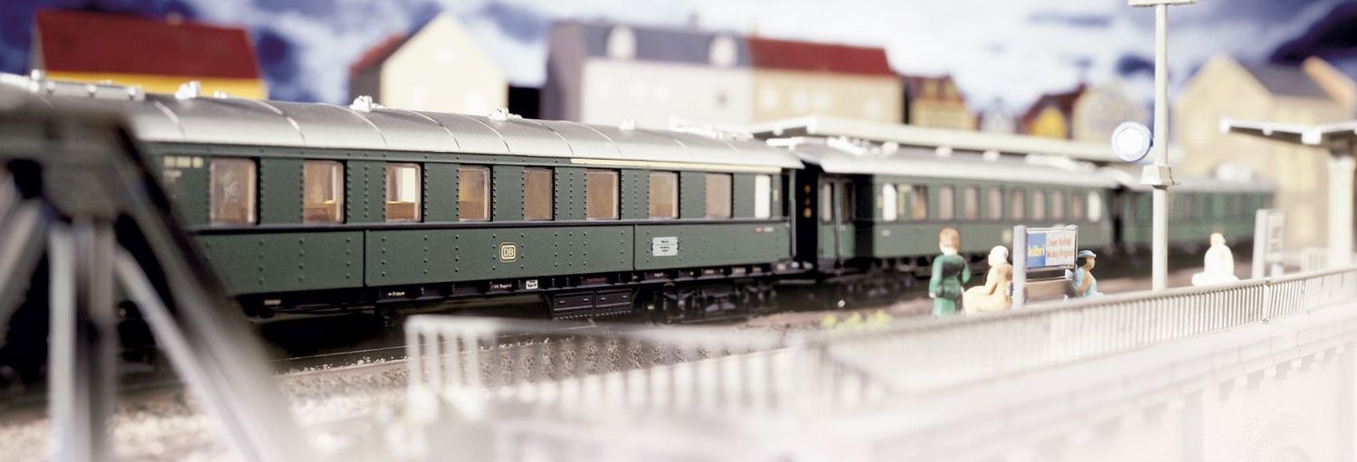 Vorbild: 4 Eilzug-Wagen mit dem Wagenlauf München – Mittenwald im Zustand um 1958. Zwei 2. Klasse-Wagen B4ywe, ein 1./2. Klasse-Wagen AB4yswe und ein Packwagen Pw4üe der Deutschen Bundesbahn (DB).