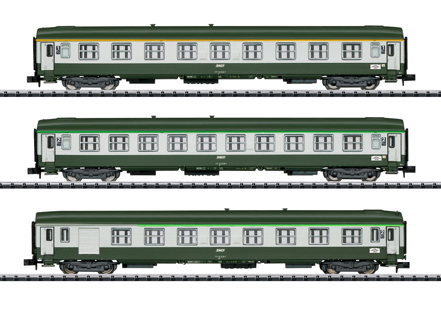 Vorbild: 1 Schnellzugwagen 1. Klasse (A9), 1 Schnellzugwagen 2. Klasse (B10) und 1 Schnellzugwagen mit Gepäckabteil (B7D) der Französischen Staatseisenbahn (Société nationale des chemins de fer français / SNCF). Einsatz: Hochwertiger Fernverkehr, hier im D262/263 Orient-Express 1987.