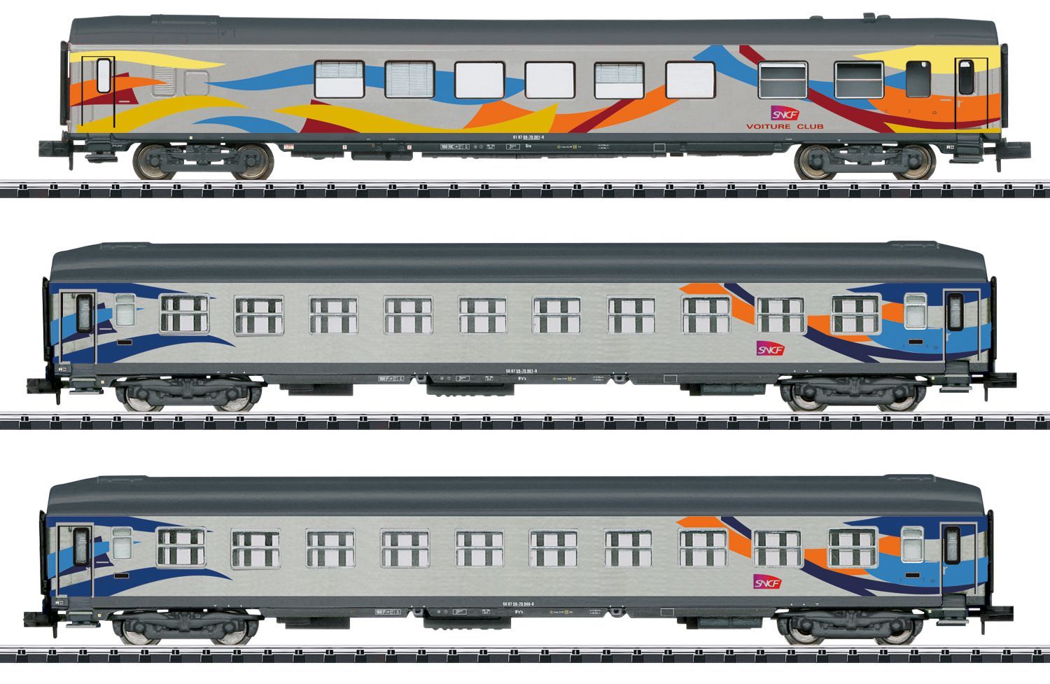 Alle Wagen mit Kinematik für Kurzkupplung. Vorbereitet für den nachträglichen Einbau einer Innenbeleuchtung. Gesamtlänge über Puffer 459 mm.