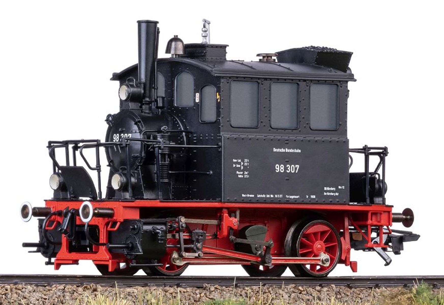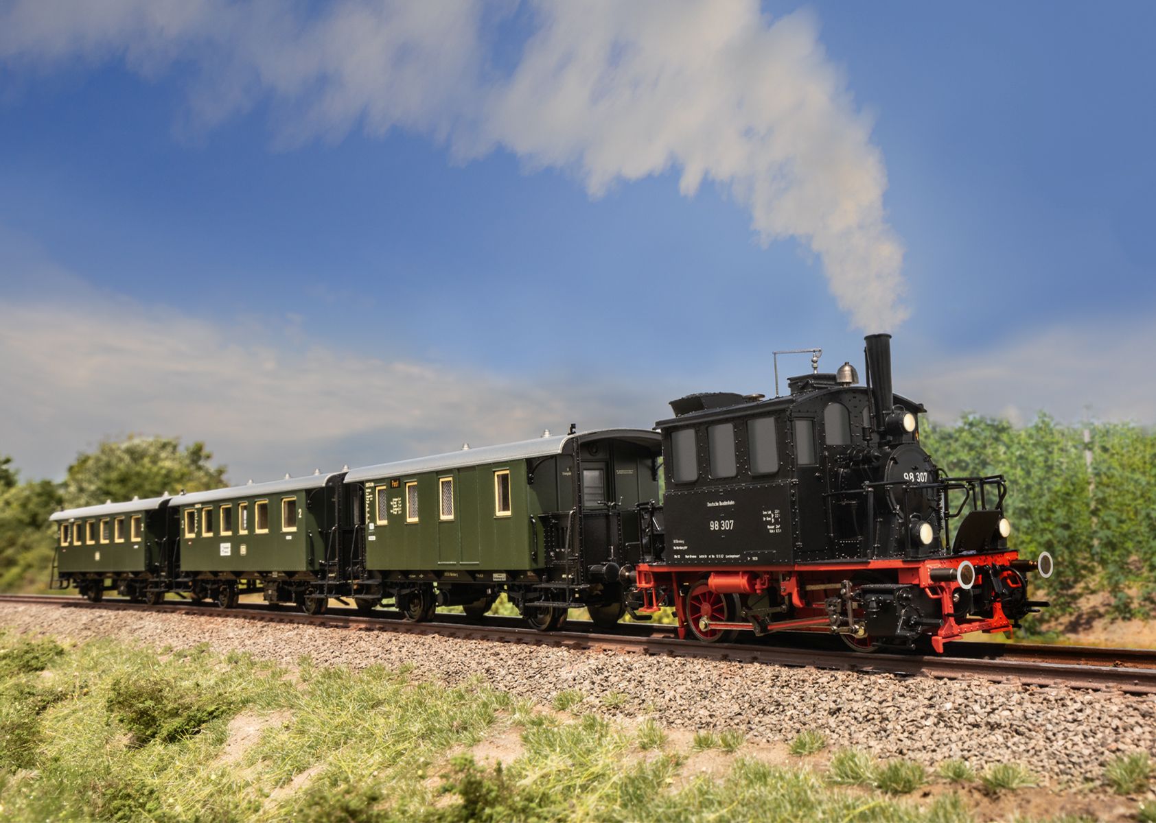 Vorbild: Baureihe 98.3 „Glaskasten“ (ehem. bayerische PtL 2/2) mit Blindwelle und Dreilicht-Spitzensignal und drei Lokalbahnwagen bayerischer Bauart der Deutschen Bundesbahn (DB). Ein Gepäck- und Postwagen und zwei Personenwagen 3. Klasse. Im Betriebszustand der Epoche III um 1957.