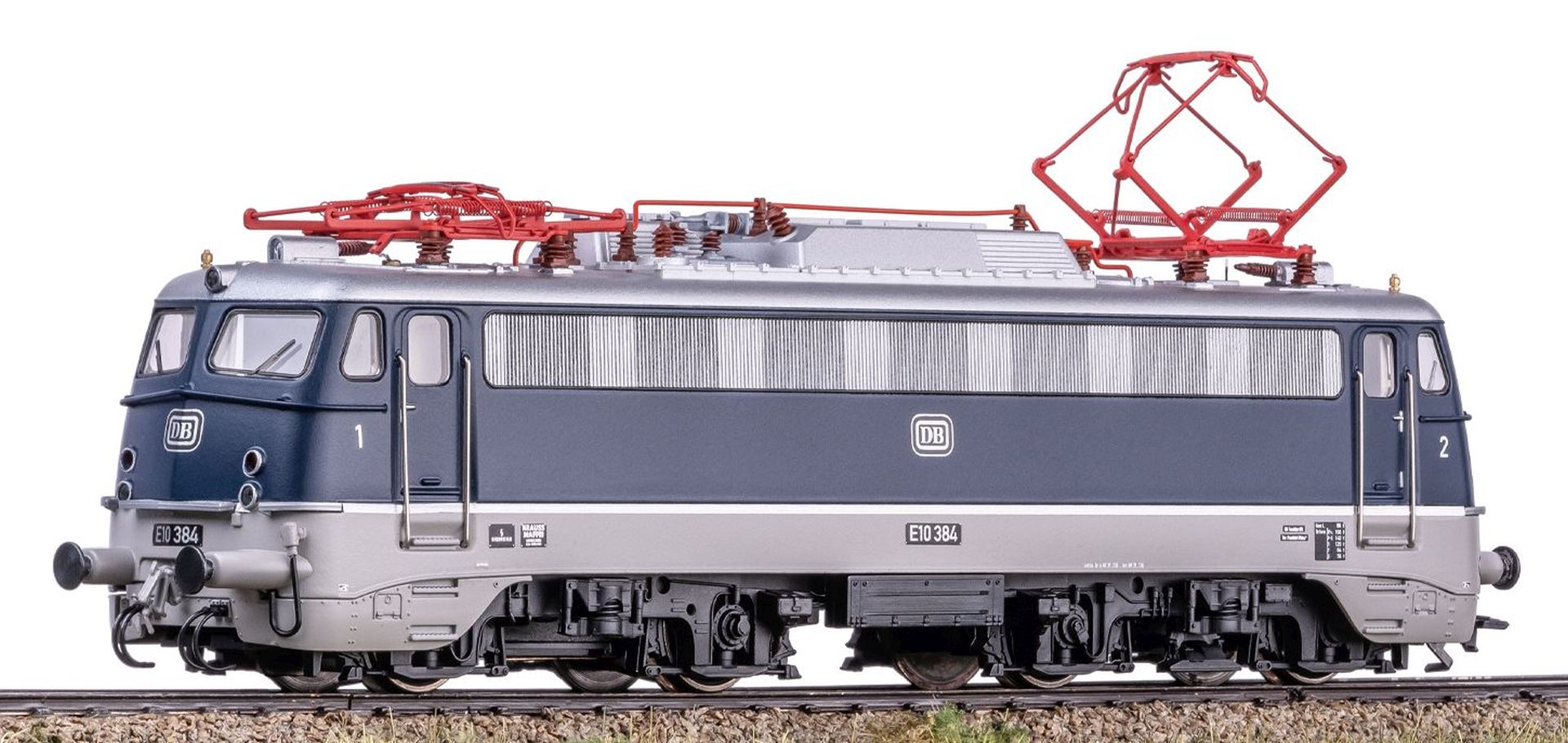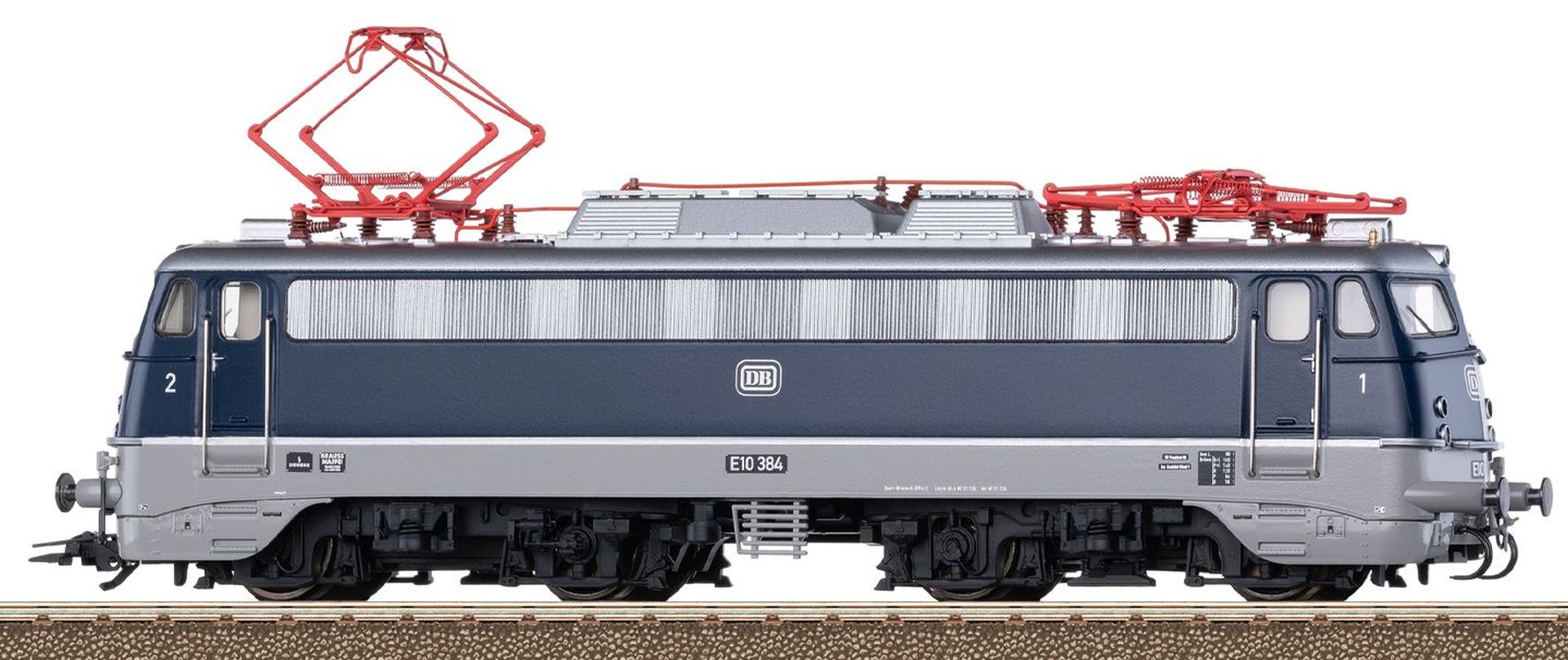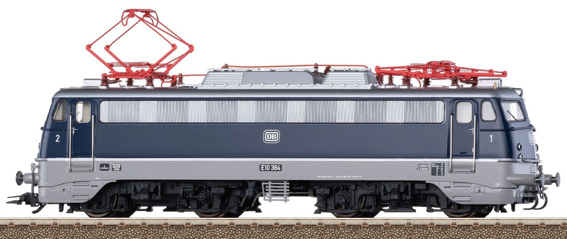 Vorbild: Elektrolokomotive Baureihe E10.3 der Deutschen Bundesbahn (DB). Lokkasten mit aerodynamischer Front, der sogenannten Bügelfalte, mit durchgehendem Lüfterband, umlaufender Regenrinne und stirnseitigen Griffstangen. Mit Pufferverkleidung und Schürze. Stahlblauer Lok-Aufbau mit steingrauem Rahmen. Lok-Betriebsnummer E10 384. Betriebszustand um 1967.