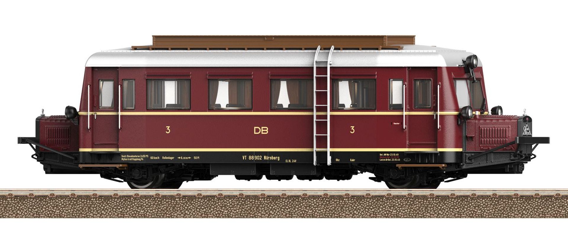 Vorbild: Dieseltriebwagen Cvt-34 „Wismarer Schienenbus“ (Typ „Hannover A“) als VT 88.9 der DB. Farbgebung purpurrot. Zustand um 1950. VT 88 902, Nürnberg.
