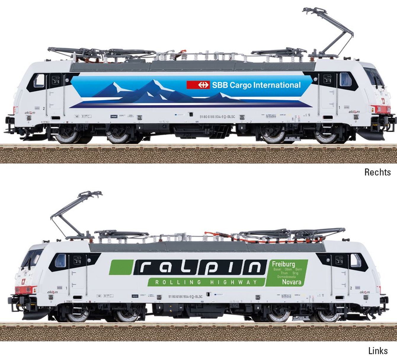 Vorbild: Elektrolokomotive Baureihe 186 der Akiem SAS, vermietet an die SBB Cargo International. Lichtgraue Grundfarbgebung mit zwei unterschiedlich gestalteten Seitenflächen. Betriebsnummer 186 904-9 „Ceneri“. Betriebszustand ab 2022.
