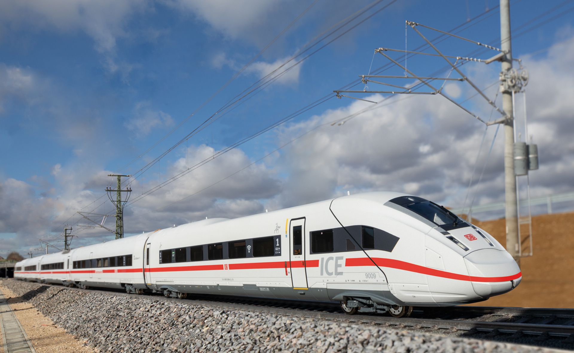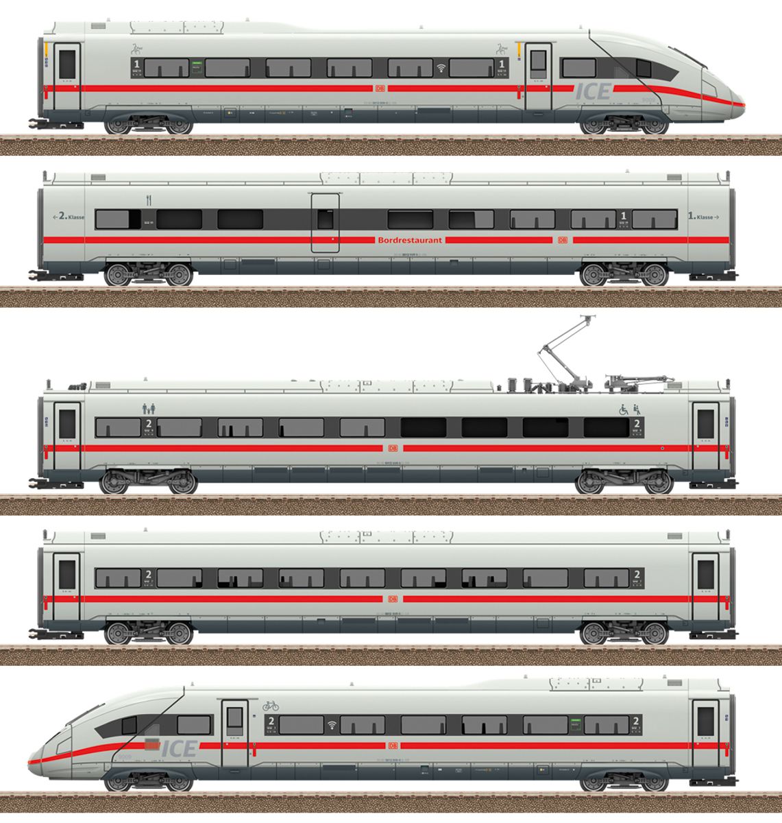 Vorbild: Hochgeschwindigkeitszug ICE 4 als Baureihe 412/812 der Deutschen Bahn AG (DB AG). 1 Endwagen EW 1.2-H, Baureihe 812, 1. Klasse. 1 Speisewagen RW "Bordrestaurant", Baureihe 812, 1. Klasse. 1 Servicewagen TW 2.2, Baureihe 412, 2. Klasse. 1 Mittelwagen MW 2-H, Baureihe 812, 2. Klasse. 1 Endwagen EW 2.2-H, Baureihe 812, 2. Klasse. Betriebszustand 2019.