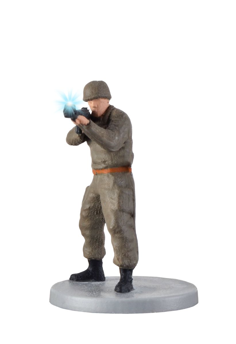 In unregelmäßigen Abständen blitzt durch eine Mikro-LED simuliertes Mündungsfeuer aus dem Lauf. Einbautiefe: 39 mm. Passend dazu unser kibri Bundeswehrsortiment. Höhe: 2 cm.