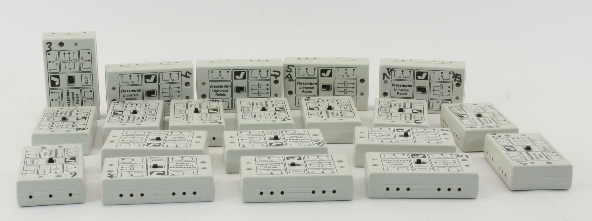 Bistabiles Relais mit 4 gleichzeitig schaltenden Umschaltern. Das Relais wandelt Stromimpulse, wie sie von digitalen Magnetartikel-Decodern, Tasten-Stellpulten, Schaltgleisen und Gleiskontakten geliefert werden, in Dauerstrom um. Zur elektrischen Steuerung von Beleuchtungen, Signalen usw. sowie für Blocksteuerungen. Durch Endlagenabschaltung mit Impuls- oder Dauerstrom schaltbar. Eine echte Rückmeldung ist in Verbindung mit dem Universal-Tasten-Stellpult Art. 5549 möglich. Mit Handbetätigungshebel. Stromaufnahme: 300 mA. Kontaktbelastbarkeit: 2 A.