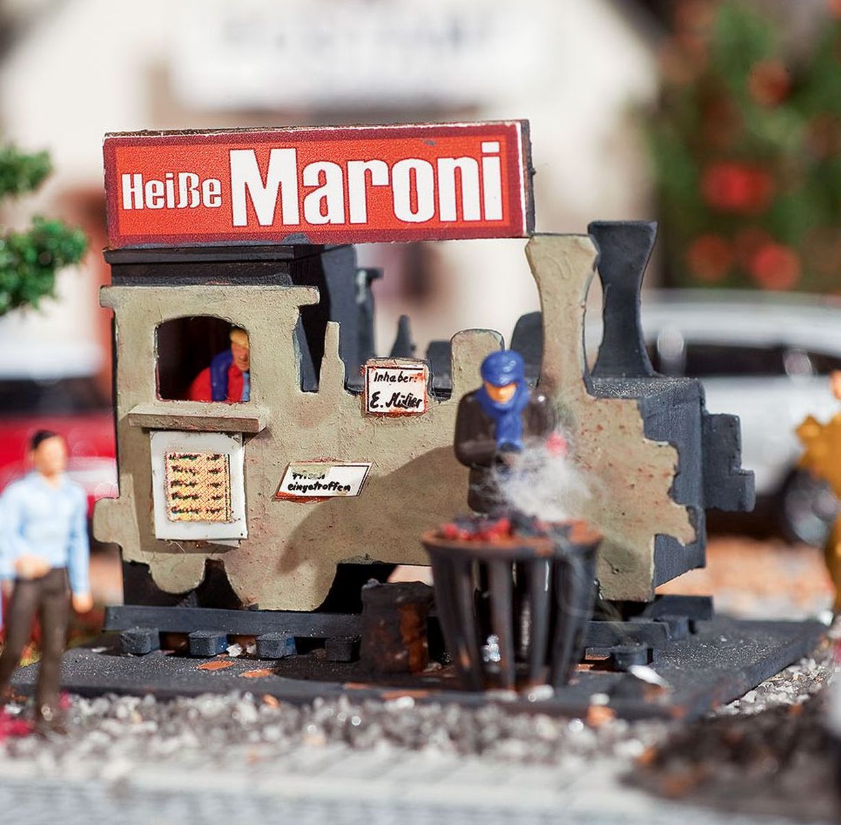 "Wenn die Tage im Herbst und Winter kälter werden, dann findet man in den Fußgängerzonen und auf Weihnachtsmärkten Maroni-Stände. Die heißen Esskastanien in Tüten wärmen die kalten Finger und die kleine köstliche Mahlzeit wird während des Einkaufsbummels vernascht. Dieser nette Maroni-Stand hat sogar einen Bezug zur (Modell-)Eisenbahn und ist eine ideale Ergänzung zum Vollmer Weihnachtsdorf Art. 42413.