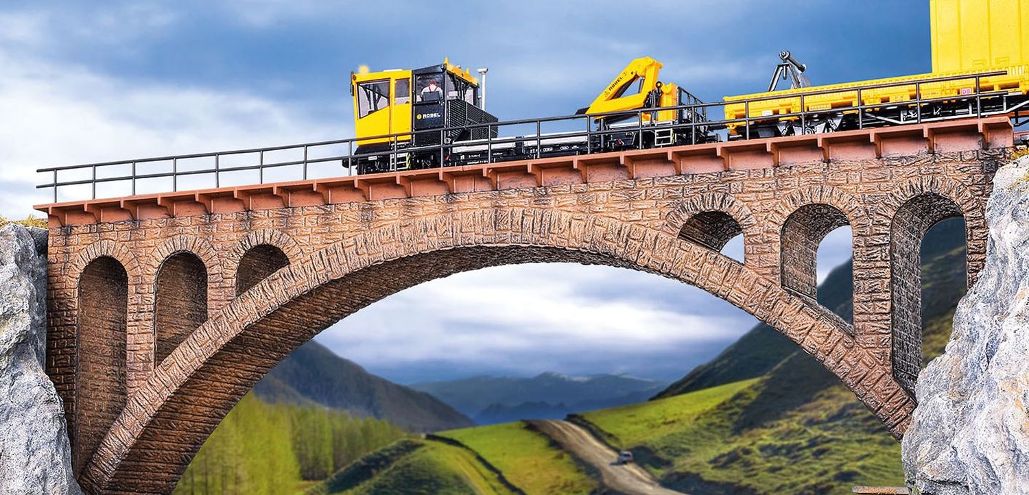 Mit aufgeständerter Fahrbahn aus Hausteinen. Die Brücke ist auch für das Märklin C-Gleis geeignet. Fahrbahnbreite: 4 cm. Maße: L 36 x B 6 x H 10,5 cm.