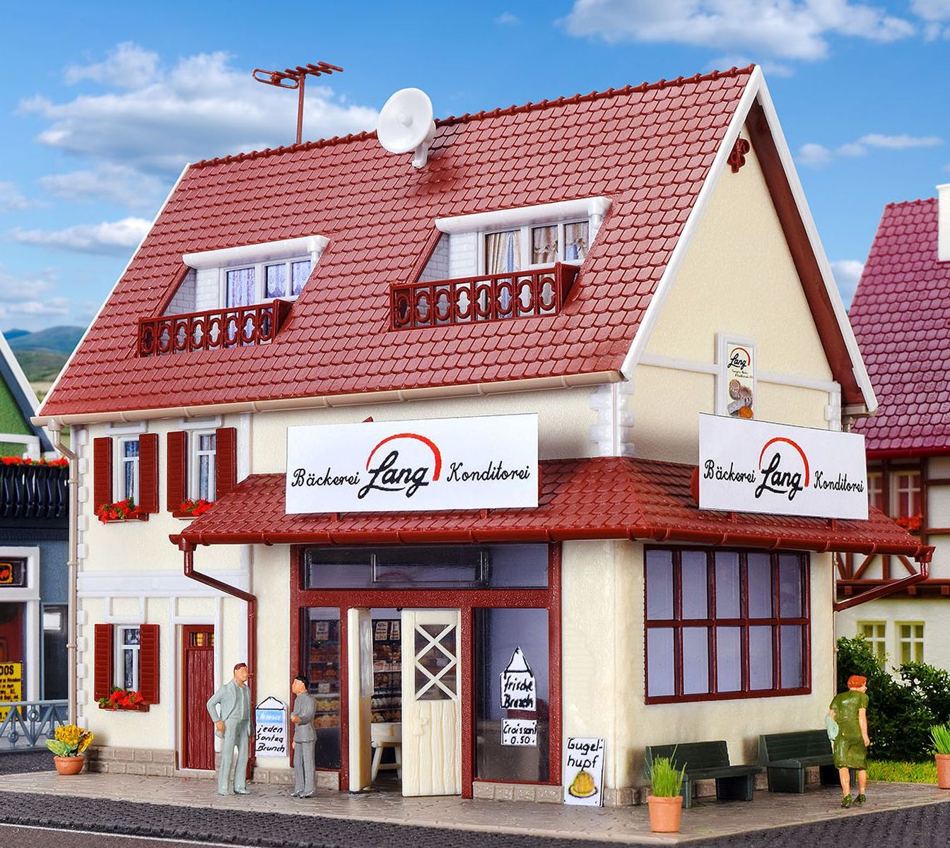 Als Max Siegfried Lang seine Ausbildung als Bäckermeister abschloss, konnte er noch nicht ahnen, dass er heute über 10 Filialen im Großraum Stuttgart sein eigen nennen würde. Die Großbäckerei wird nach wie vor als Familienbetrieb geführt und Herr Lang kontrolliert täglich selbst sowohl die Qualität seiner Backwaren als auch die Gestaltung und Sauberkeit seiner Filialen, die alle im Franchise-System betrieben werden. So hat auch hier in unserer Miniaturwelt an der Ecke eine Filiale eröffnet und erfreut sich regen Zuspruches. Die hellen Verkaufsräume mit den großen Fenstern, Inneneinrichtung und beiliegender Beleuchtung laden zum Einkauf oder auf einen gemütlichen Kaffee ein.
