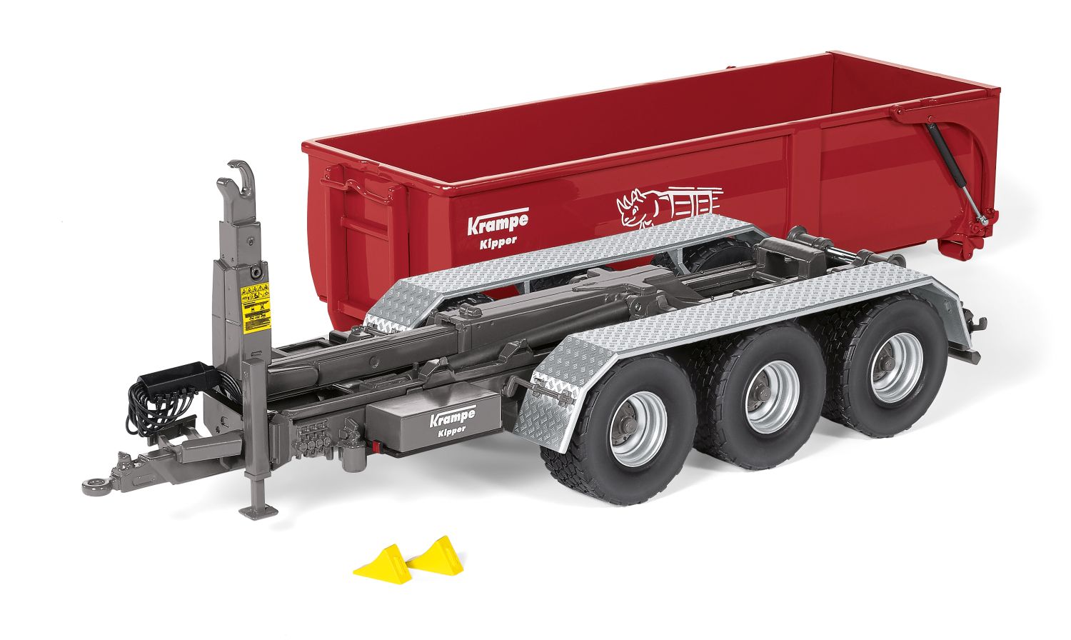 Höchstmaß an Vorbildnähe in den Aktionsfunktionen Was im Nutzfahrzeugbereich längst Alltag ist, hat Krampe für die Landwirtschaft hoffähig gemacht. Der dreiachsige Hakenlift THL 30 L kann eine 30-Tonnen-Mulde ziehen – WIKING hat das Fahrgestell und die variable Mulde mit ihren hohen Seitenwänden vorbildgerecht realisiert und damit das leistungsstärkste Gespann für die 200-PS-Schlepper-Klasse 32-fach miniaturisiert. Das Fahrgestell besteht aus einem detaillierten Fahrgestellrahmen mit Deichsel, der aus Metall gehalten ist. Auf diese Weise können durchweg reizvolle Gespanne mit den zur Verfügung stehenden WIKING-Schleppern zusammengestellt werden. Gerade bei diesem innovativen Ladewagen sorgen die Details für Betrachterfaszination. Die drei Achsen erhalten eine ballige Bereifung, die üblicherweise auch mit grobstolligem Profil ausgerüstet ist. Wunderschön vorbildgerecht erscheinen die Kotflügel in authentischer Riffelblech-Optik – natürlich aus Metall. Ein Stützfuß vorne links sichert die Standfestigkeit, während die Steuerungsboxen, aber auch Ölfilter und andere Anbauteile das Präzisionsmodell detailfein aufwerten. Am Heck erhält die Stoßstange entsprechend eingesetzte Rückleuchten. Genauso detailreich wie die bewegliche Hakenlift-Einrichtung nachgebildet wird, lässt sich auch die Luftfederung mit Luftbalg erkennen. Wer dann wissen will, warum Landwirte inzwischen in großer Zahl den Krampe Tridem Hakenlift beschaffen, der erkennt es spätestens, wenn er die Funktionen des WIKING-Modells ausführt. Die erste und letzte Achse erscheinen gelenkt, der Stützfuß ist selbstverständlich beweglich ausgeführt. Die Bewegungsabläufe beim Anheben und Abrollen der Mulde erscheinen vollends realitätsgetreu. So führen die Präzisionsmodellbauer den Arm am Hakenlift teleskopierbar aus. Und selbst bei der scheinbar so profanen Transportmulde entfacht WIKING die große Liebe zum Detail. Diese Mulde aus Metall mit hohen Seitenwänden erscheint fühlbar gewichtig und kann heckseitig geöffnet werden. Außerdem steht die Mulde auf breiten beweglichen Metallrollen, die das Absetzen des offenen Transportcontainers unterstützen.