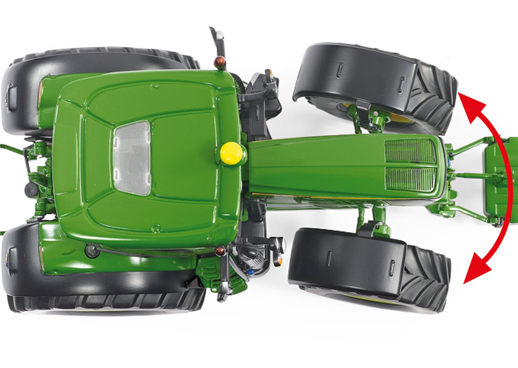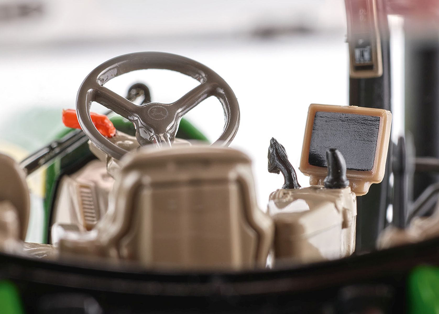 Topaktuelles Interieur beim Erfolgsschlepper WIKING gibt dem John Deere 6R 250 neue Modelldetails auf den Weg. So erscheint der Erfolgsschlepper mit neuer Motorhaube, die dem Schlepper mehr Designästhetik gibt. Außerdem wurden der Arbeitsscheinwerfer und der Auspuff angepasst. Das Display wanderte in Richtung der A-Säule und ist damit hinter dem Lenkrad verschwunden. Mit dem beim Vorbild auf höchste Vielseitigkeit und Bestleistung getrimmten 6R erscheint in der 32-fachen Miniaturisierung ein Kraftpaket, das sämtliche Herausforderungen wie schwierigste Gelände- und Einsatzbedingungen sowie enge Zeitfenster souverän meistert. Mit dem John Deere 6R 250 miniaturisieren die Traditionsmodellbauer einen Traktor, der bereits erfolgreich in der europäischen Landwirtschaft unterwegs ist. Und genau für die Sammler von Präzisionsminiaturen ist der 6R 250 gemacht. Gerade die technikfaszinierten Landmaschinenfreunde wissen das Mehr an optischer WIKING-Modellqualität auch in der 32-fachen Miniaturisierung zu schätzen. Die Motorhaube lässt sich öffnen, sodass sich dank detailreicher Darstellung das leistungsstarke Aggregat vorbildgerecht erkennen lässt. Das Modell verfügt über bewegliche Ober- und Unterlenker. Das Zugmaul wird als Anhängevorrichtung ausgeführt. Vorn lässt sich das Frontgewicht abnehmen. An der Kabine sind beide Seitentüren sowie das Heckfenster zu öffnen. Über das Lenkrad ist zusätzlich auch die Pendelachse steuerbar. Beide Außenspiegel sind klappbar. Vorbildgerechte Ausführung erfährt das Kabineninterieur mit sämtlichen Instrumenten. Das Display befindet sich jetzt in Höhe der A-Säule. Kennzeichen, Warnschilder und Leuchten, aber auch Hydraulikanschlüsse erhalten eine filigrane Bedruckung. Auch das Heck erscheint ausgesprochen realistisch nachgebildet, die Reifen sind grobstollig ausgeführt.