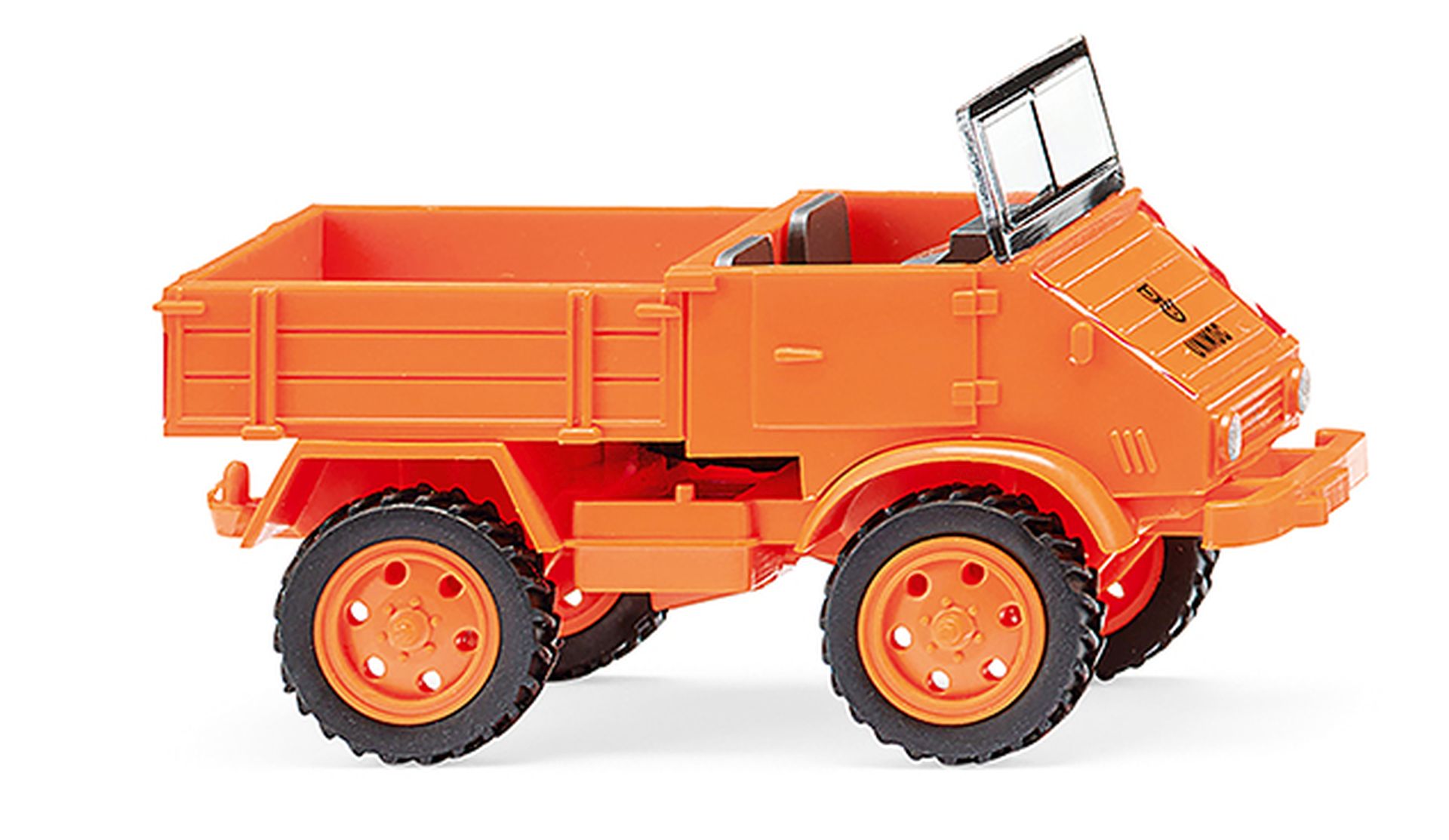 Unverzichtbarer U 411: Als der Bauhof seine Arbeit begann Es waren die Anfänge im Nachkriegsdeutschland, als die städtischen Bauhöfe aufrüsteten – der Unimog 411 im Warnorange jener Jahre gehörte oft zu den Fahrzeugen der ersten Stunde. Meist liefen sie viele Jahre und waren sogar noch in den Siebzigerjahren unterwegs. Danach gehörte die rotweiße Warnschraffur längst zu den auffälligen Gestaltungselementen. Auf der DLG-Ausstellung 1948 in Frankfurt feierte das Boehringer-Vorbild, das später als Unimog zur Legende werden sollte, Premiere. Schon im März 1949 bauten die Gebrüder Boehringer die Zugmaschine für die Land- und Forstwirtschaft in Göppingen in Serie, bevor die Fertigung 1951 an den jahrzehntelangen Unimog-Standort Gaggenau verlegt wurde und Daimler-Benz die Regie der Typenfamilie übernahm. Offene Kabine sowie Fahrgestell und Kardanteil pastellorange. Sitzreihe schiefergrau, Lenkrad schwarz. Pritscheneinlage sowie Felgen pastellorange. Kühlergrill mit silbernem Mercedes-Benz-Stern bedruckt. Motorhaube mit Unimog-Schriftzug sowie Ochsenkopf. Außerdem rot-weiße Warnschraffur vorne und hinten aufgedruckt. Transparentes Fensterteil mit schwarzgrauem Rahmen und Mittelsteg.