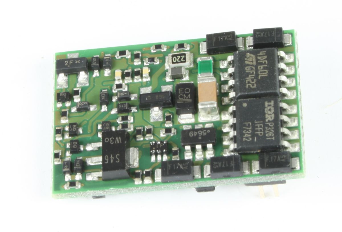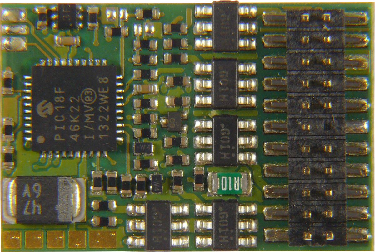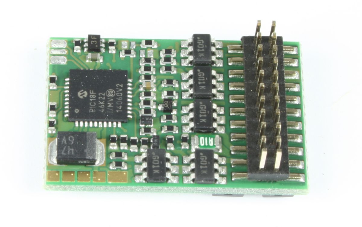 H0 Decoder mit Energiespeicher-Anschaltung - 22 x 15 x 3,5 mm - 1,2 A (auch Goldcap-Module aus 7 Goldcaps als Energiespeicher), 10 Funktionsausgänge (davon 4 mit Drähten, 6 auf Löt-Pads), 11 Anschlussdrähte (außer Direkt-Varianten), voll ausgestattet mit allen ZIMO Eigenschaften: DCC und MM, 2 Servo- Steuerleitungen, SUSI, RailCom, NMRA und ZIMO Function mapping, u.v.a.